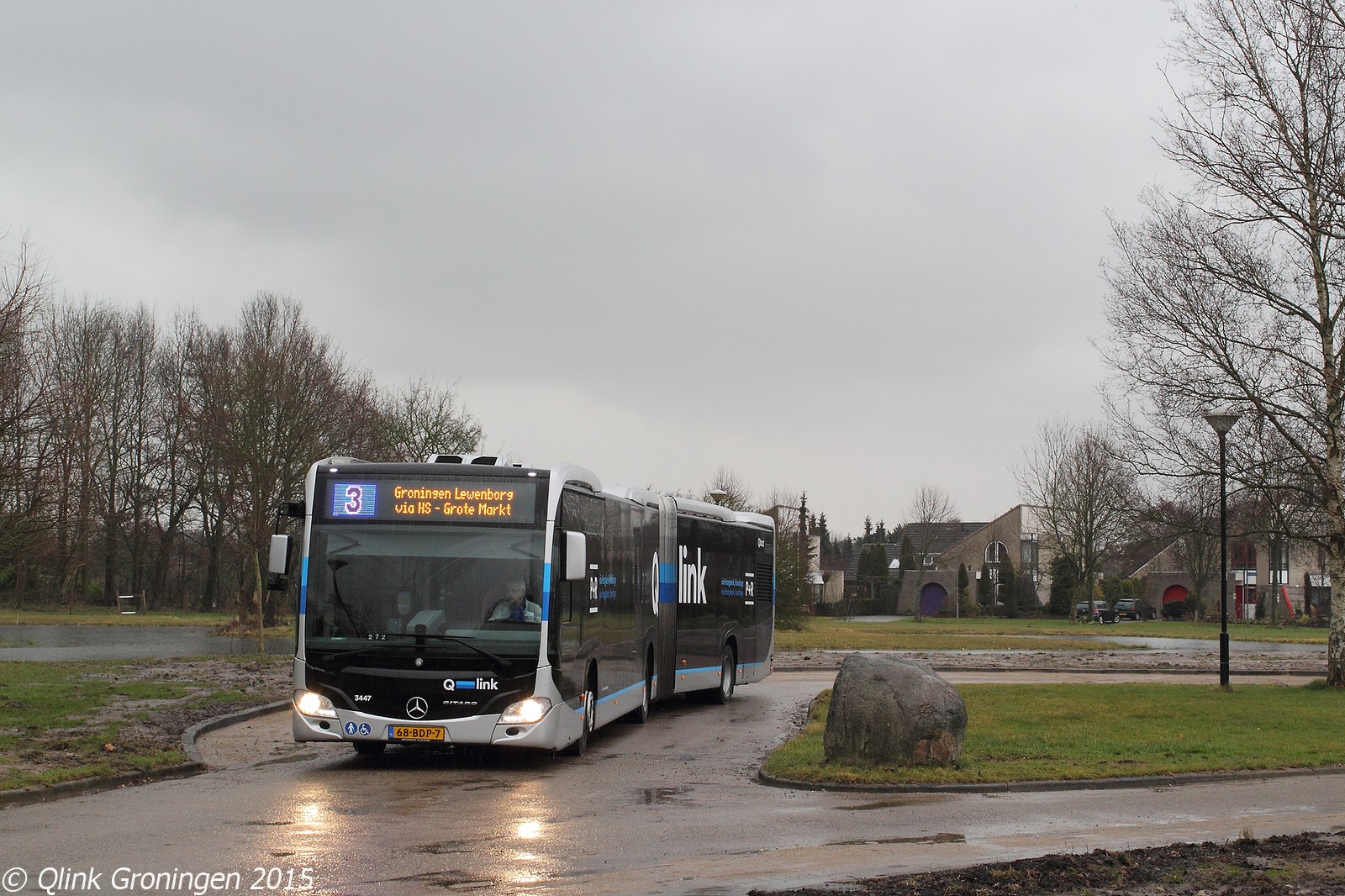 Nadat in het begin van Q-link het eindpunt van de HOV-bus in Leek was verplaatst naar de Auwemalaan, kwam er veel protest uit de wijk De Linde. Uiteindelijk bleek het makkelijk om de bus door te laten rijden naar de Bousemalaan, waar een nieuwe eindpuntvoorziening moest worden gezocht. Al snel werd een oplossing gevonden om de bus te laten keren op het terrein van Stichting De Zijlen. Op de foto is bus 3447 te zien, die op 3 maart 2015 vertrekt van zijn nieuwe eindpunt in Leek.