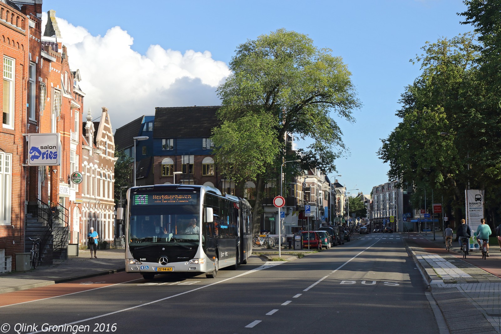 Per eind augustus 2016 zouden een aantal nieuwe gelede bussen gaan instromen om tijdelijk onder andere de Hess-bussen die naar Utrecht zijn gegaan te vervangen. Deze gelede bussen, Mercedes Benz Citaro G C2, zijn bestemd voor de nieuwe Q-link lijn 6 tussen Delfzijl en Haren en zouden eerst in een blanco kleurstelling onder andere op Q-link lijn 11 instromen. Echter, door productieproblemen zijn de bussen vertraagd en waren er tijdelijk te weinig bussen voor de concessie. Daardoor moeten alle zeilen worden bijgezet en verscheen reservebus 3400 weer op Q-link Groen. Op de foto is de bus te zien bij de halte Noorderplantsoen en zou op 29 augustus 2016 richting zijn eindpunt Reitdiephaven rijden.