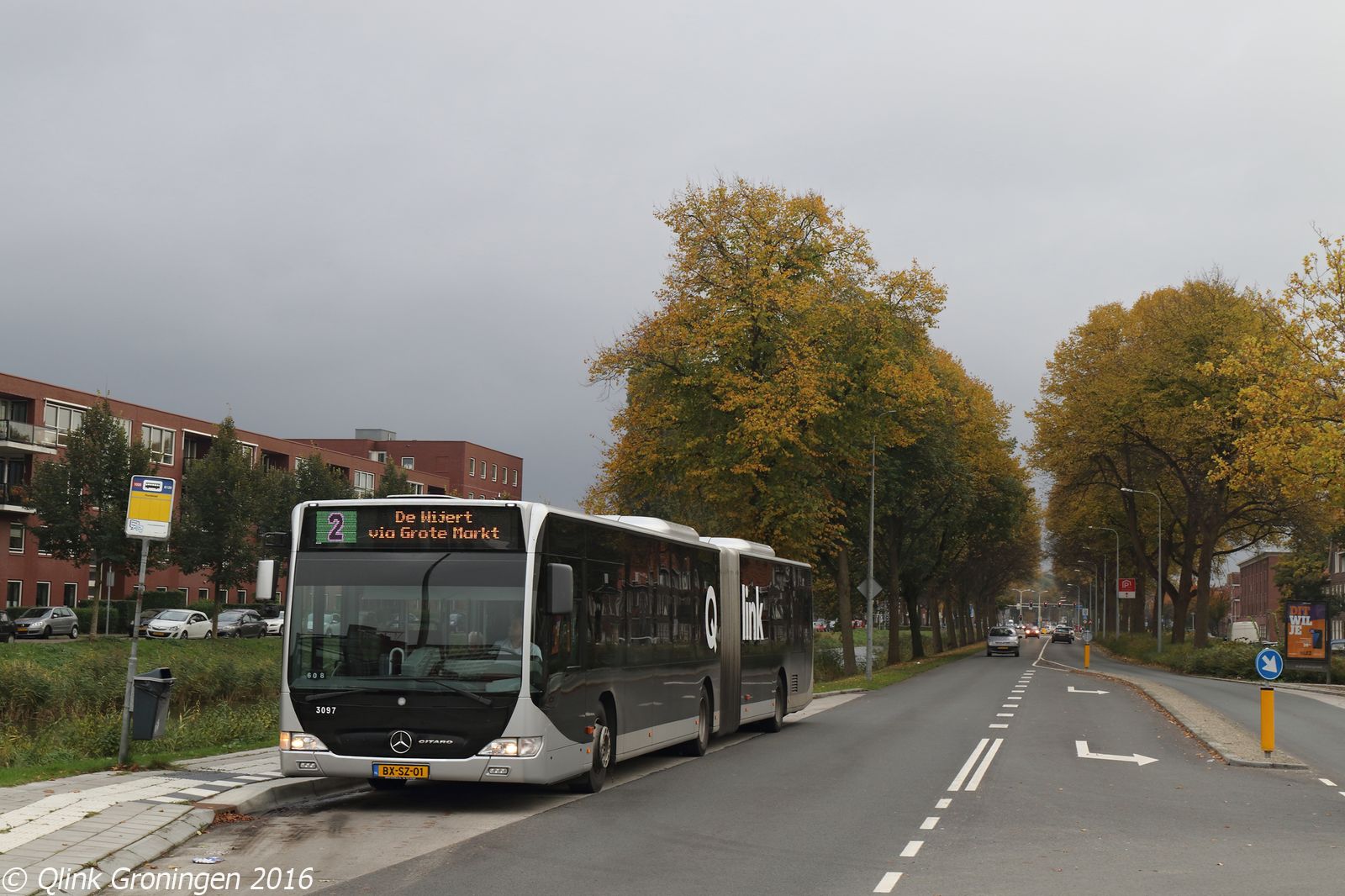 In december 2016 zouden de gelede bussen in de Korrewegwijk verdwijnen vanwege een gewijzigde routevoering van alle lijnen in Groningen-Zuid. Dit kwam door een reizigersdaling op bepaalde lijnen als gevolg van de invoering van Q-link. Een kleine twee maanden voor het verdwijnen van de gelede bussen op de route van lijn 2 kwam Q-link reservebus 3097 op deze lijn terecht. Het was een opmerkelijke verschijning tussen de normaal alleen rood-grijze bussen in deze wijk. Op de foto is de bus bij de halte Poortstraat te zien en vertrekt richting De Wijert terwijl hij de fotograaf op 22 oktober 2016 passeert. Gelede bussen zouden hier tot december 2016 uiteindelijk toch nog te zien blijven.