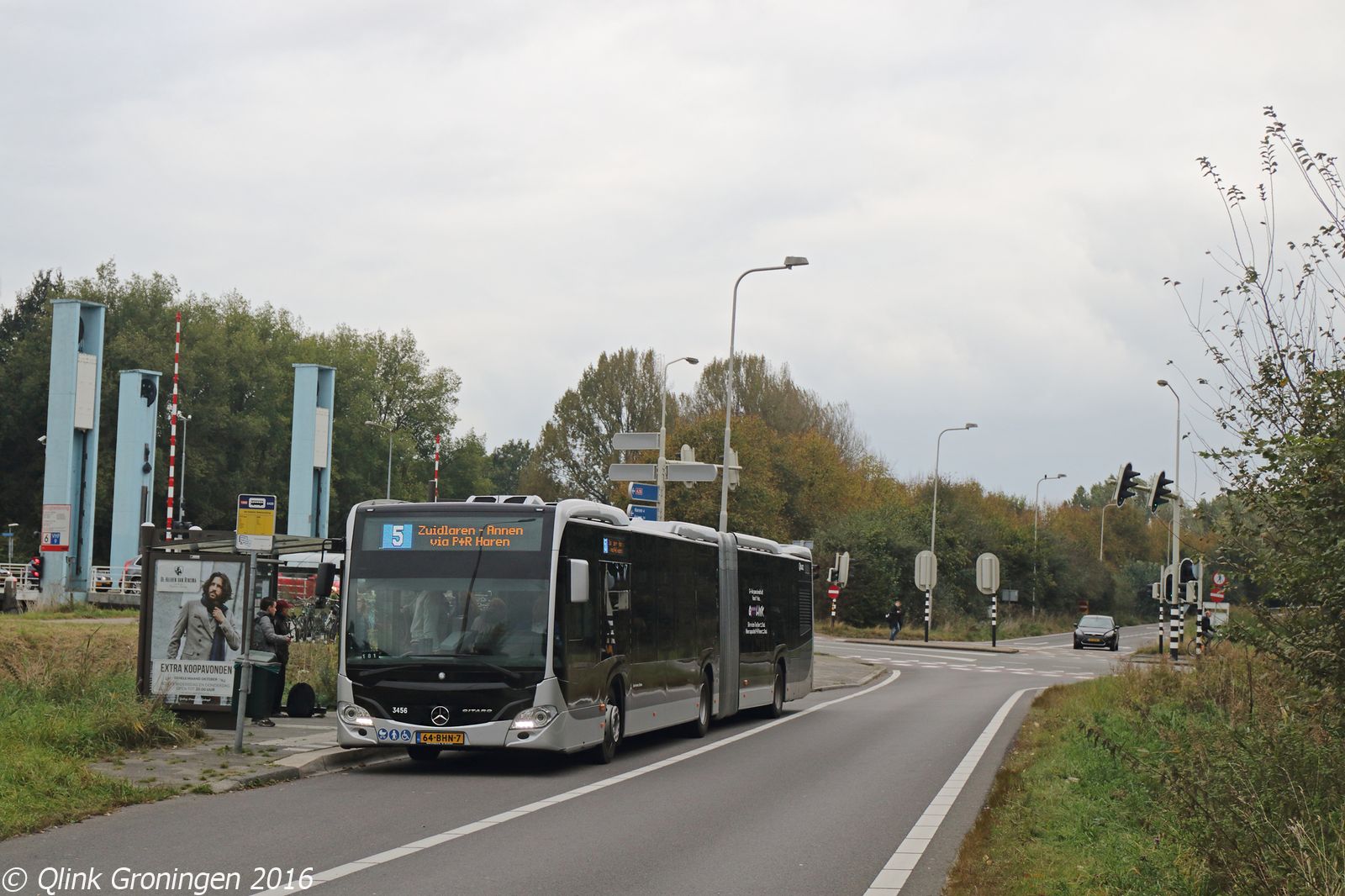 Bijna dagelijks reden op de Paarse Q-link 5 een aantal nieuwe Q-link bussen, die waren aangekocht voor de uitbreiding met de Paarse Q-link 6. Deze bussen werden dan ook voorzien van een dubbele kleurenbestickering, net als bij de Blauwe Q-link lijnen. Q-link 5 zou dan uiteindelijk ook een van de stamlijnen voor deze bussen worden. Op de foto staat bus 3456 op 13 oktober 2016 bij de halte Van Ketwich Verschuurbrug en rijdt verder via P+R Haren naar Zuidlaren en Annen.