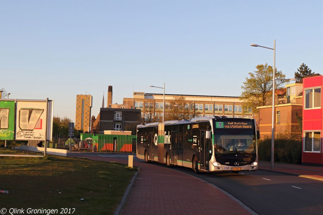 Een dag na het nemen van de eerdere foto’s werd in de late avond van 28 april 2017 naar Groningen getogen om een laatste plaatje te maken van de nieuw bestickerde Q-link Groene Mercedes-Benz Citaro C2 bussen. Op de foto passeert bus 3423 de fotograaf op de busbaan Kolendrift in het allerlaatste licht van deze dag en is op weg richting Station Noord en Reitdiephaven als hij de fotograaf passeert.
