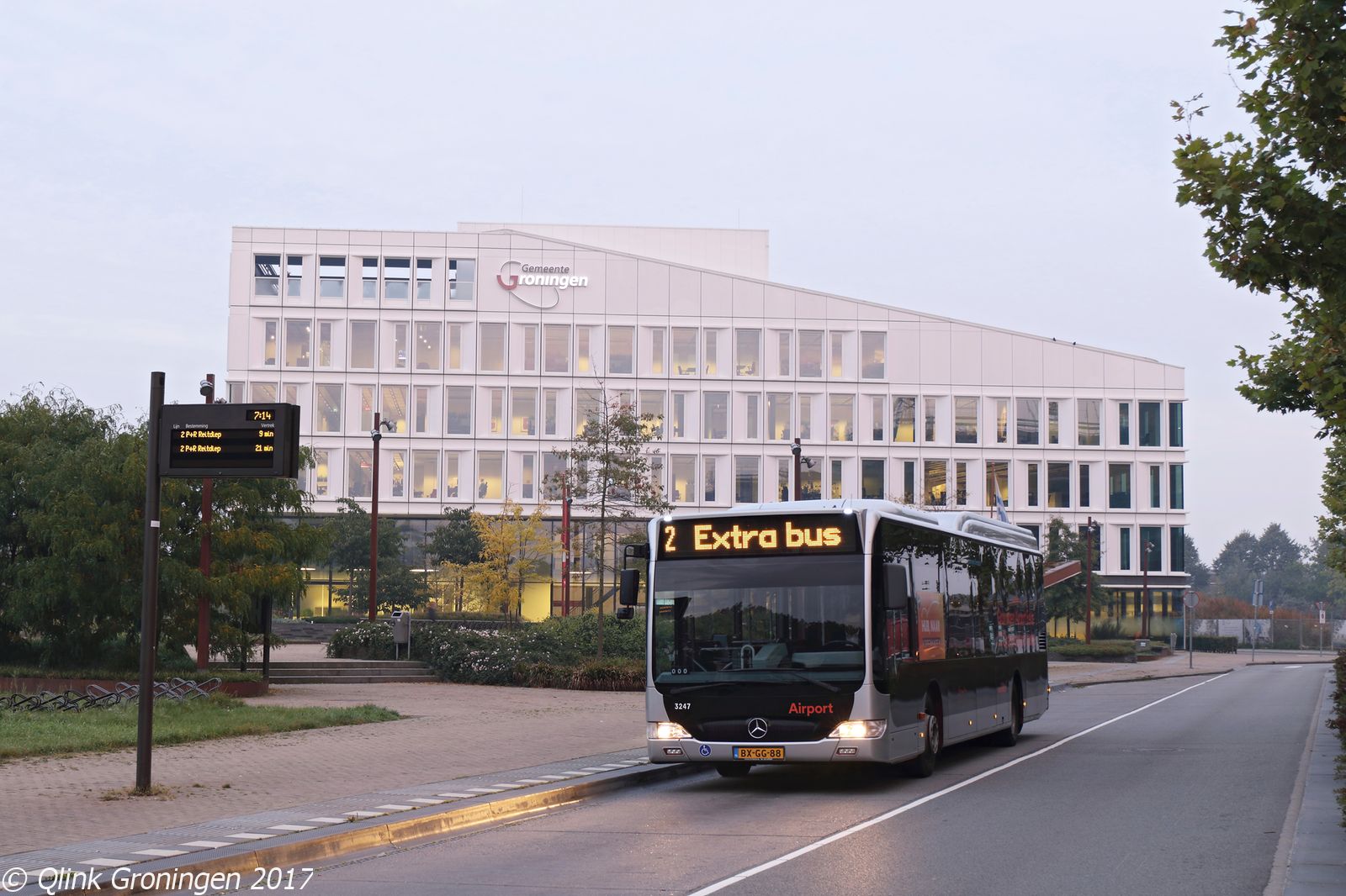 Omdat P+R Meerstad pas op 14 oktober 2017 gereed is, moeten reizigers die naar het UMCG reizen met de huidige Q-link 2 vanaf P+R Euroborg worden vervoerd. Omdat deze lijn later begint te rijden dan Q-link 5 die eerder op deze route reed, worden op het traject van Q-link 2 tussen Station Europapark en het UMCG vier extra ritten ingepland, die worden uitgevoerd met de Airport-bussen. Op de foto staat bus 3247 klaar bij Station Europapark en zal op 22 september 2017 zo meteen zijn laatste extra rit richting het UMCG maken.