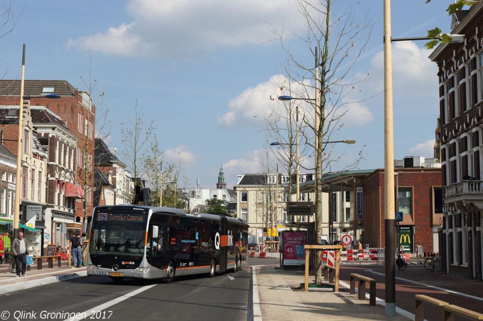 Vanaf 3 september 2017 ging Q-link Oranje via de Westerhaven rijden. Op deze locatie is in de maanden ervoor een nieuw overstappunt gerealiseerd vanwege het verdwijnen van de bussen van het A-Kerkhof. Omdat de drukte op de Eendrachtskade steeds verder toeneemt, is besloten Q-link 15 via dit nieuwe knooppunt te laten rijden. Op de foto is bus 3401 te zien op 3 september 2017, terwijl hij op weg is naar de Zernike Campus, vlak voordat hij stopt bij de halte aan de Westerhaven.