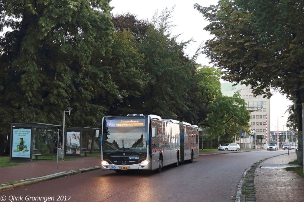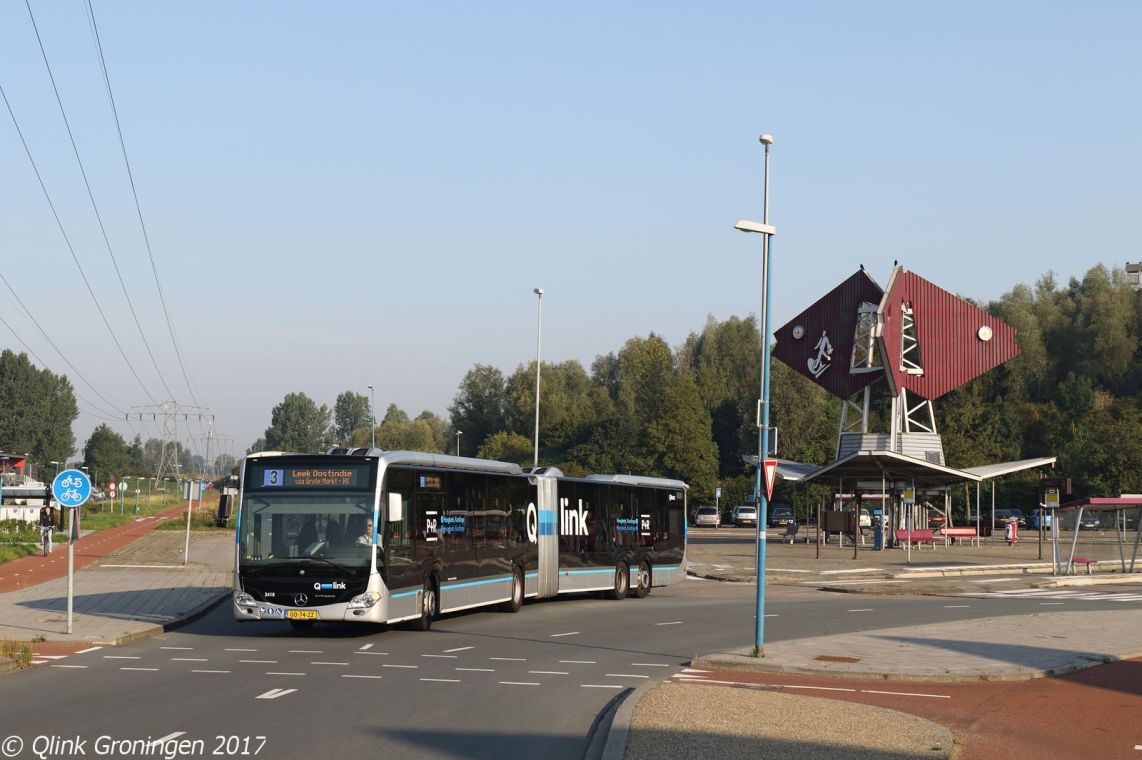 De sinds april 2017 rijdende Capacity L-bussen op Qlink 3 kregen met de grote tussentijdse dienstregelingswijzigingen op 3 september 2017 hun definitieve uiterlijk. Dit betekent dat de stickers die aangaven dat de bussen 15% meer capaciteit hebben dan hun normale gelede tegenhangers zijn verdwenen. Op de foto vertrekt bus 3410 vanaf P+R Kardinge op 4 september 2017 en is als Q-link 3 op weg richting Leek Oostindie.
