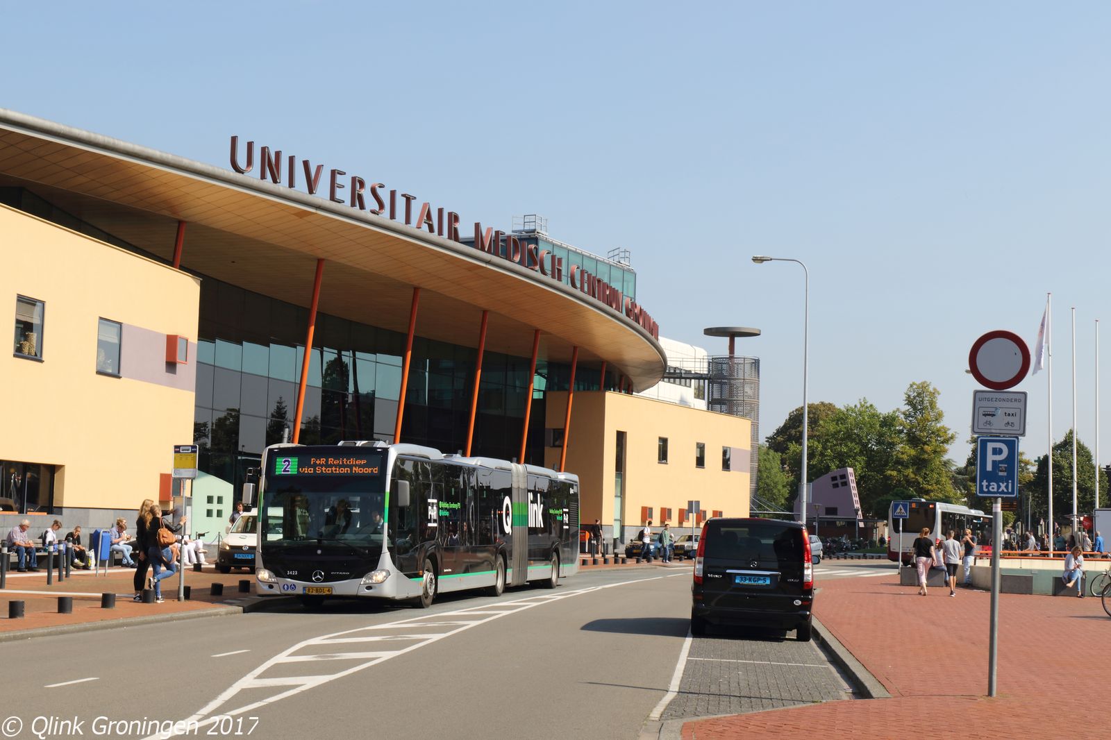 Na het eerste beeld van Q-link 2 bij P+R Euroborg/P3 werd later de nieuwe Q-link-lijn op de foto gezet bij de hoofdingang van het UMCG in Groningen. Zoals eerder beschreven is lijn 64 komen te vervallen door de invoering van deze lijn, omdat deze nu zorgt voor de verbinding tussen het UMCG en Station Noord. Op de foto van 3 september 2017 staat bus 3423, die reizigers naar P+R Reitdiep in zijn bus laat en verder zou rijden als Q-link 2 richting zijn eindbestemming.