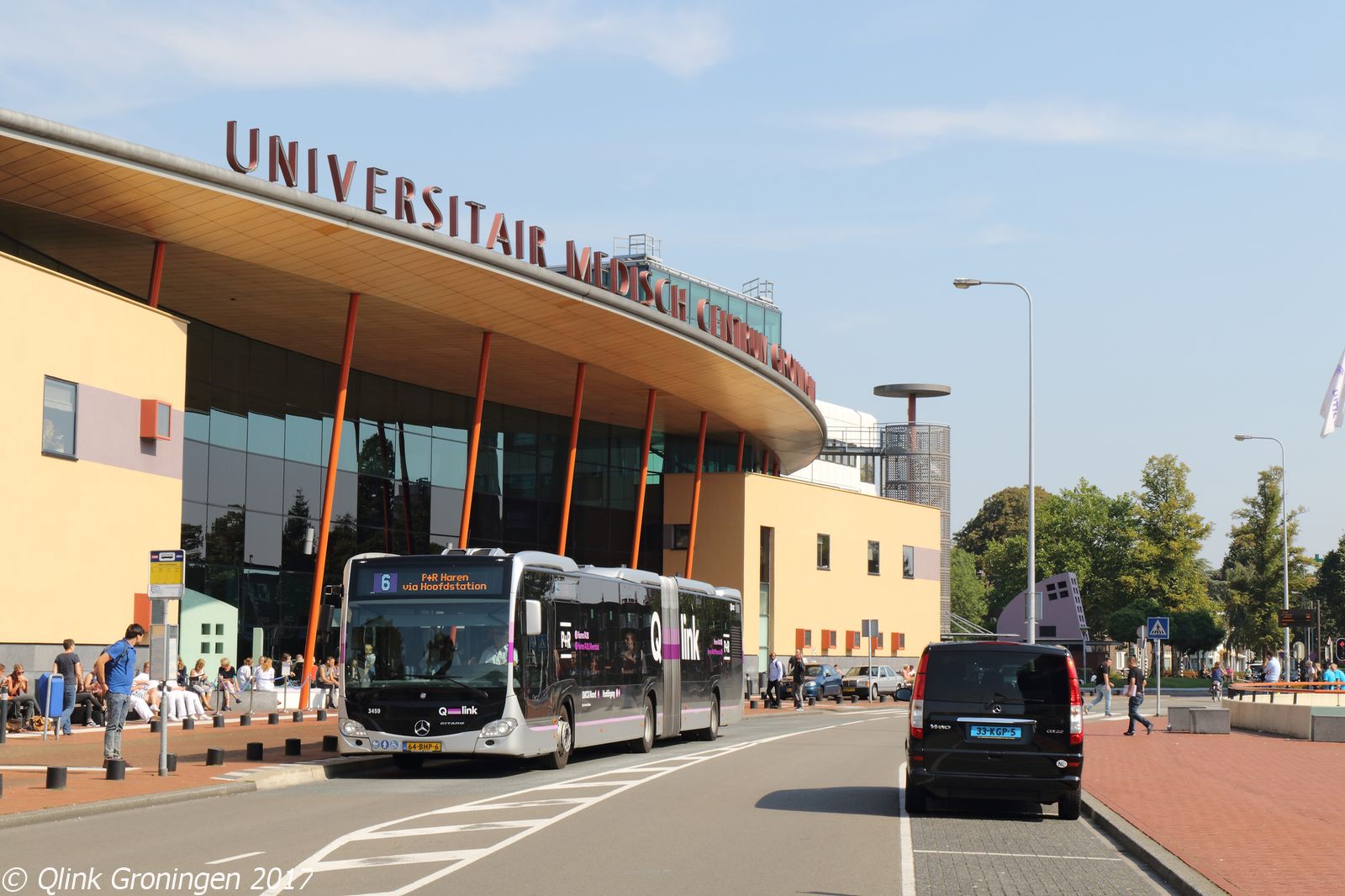 Zoals eerder beschreven begon Q-link 6 vanaf 3 september 2017 te stoppen bij de halte UMCG Hoofdingang. Deze keuze voor een extra halte op deze lijn werd gemaakt omdat Q-link 5 steeds drukker werd en de steeds groeiende stroom passagiers niet meer aankon. Vanwege het ontbreken van de aanpassing van de verkeerslichten bij de kruising Petrus Campussingel en het Damsterdiep kon deze routewijziging niet eerder plaatsvinden. Op de foto staat bus 3459 bij zijn nieuwe halte UMCG Hoofdingang, klaar om verder te rijden richting P+R Haren.