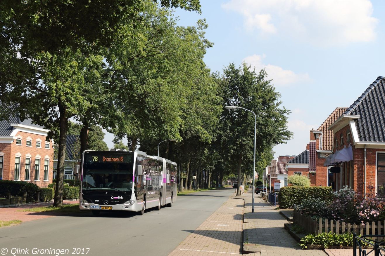 Op 3 september 2017 kwam de paarse Q-link-bus 3461 terecht op lijn 78. Deze lijn, die normaal wordt uitgevoerd met de bekende rood-grijze streekbussen, zou vanaf december 2017 worden vervangen door Q-link 5, die tot Scharmer zou gaan rijden. Het overige routedeel wordt opgenomen in de huidige streeklijn 178. Op de foto passeert de bus de fotograaf op de Hoofdweg in Harkstede. Een beeld dat vanaf de volgende dienstregeling tot de dagelijkse praktijk zou gaan behoren.