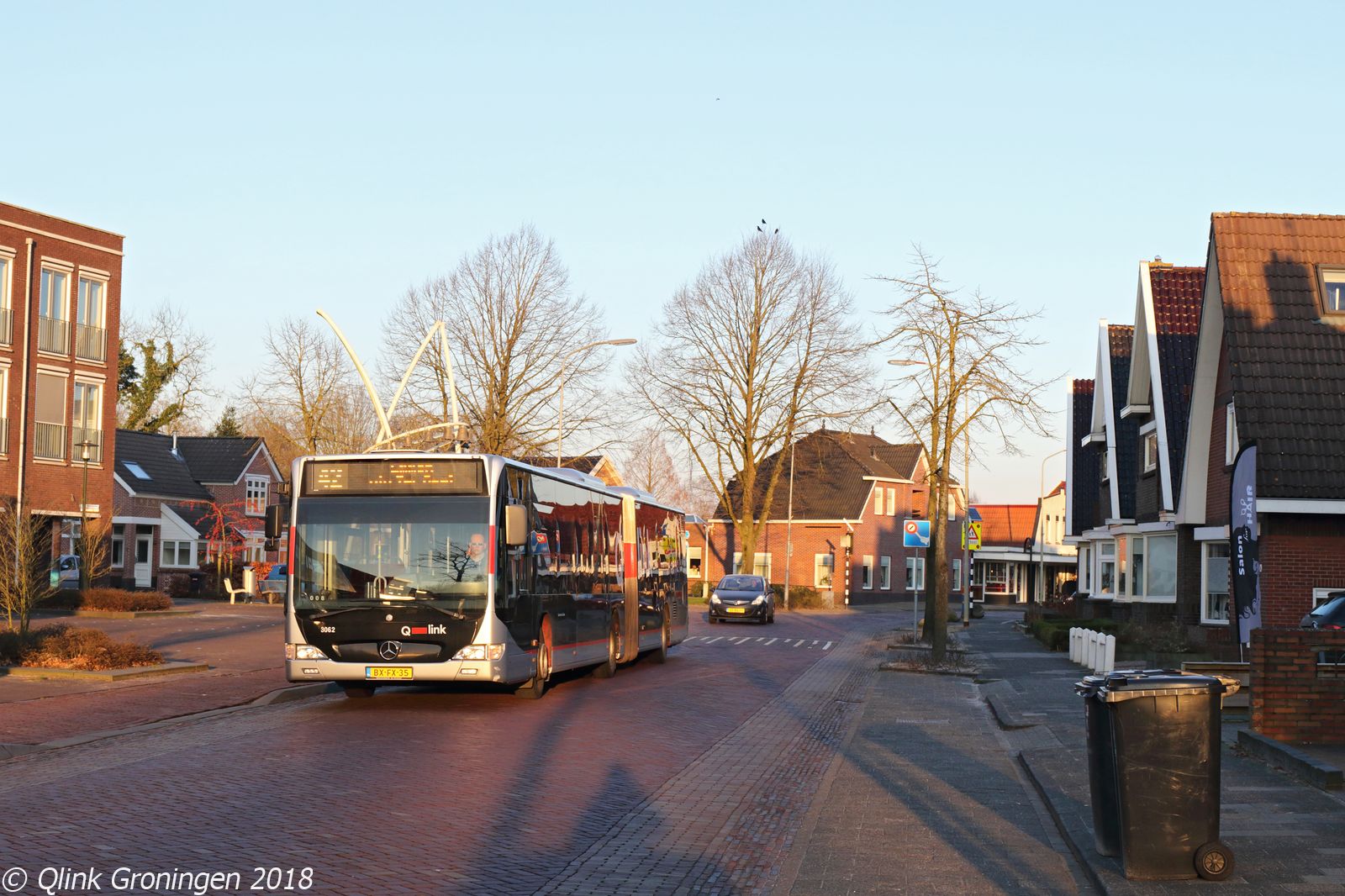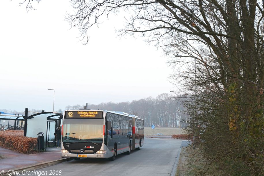 Sinds 10 december 2017 rijdt rond Emmen de nieuwe Q-link lijn 12 die de kleur Rood heeft gekregen. Naast dat de meeste ritten rijden tussen Emmen en Klazienaveen, starten ’s ochtends ook twee ritten in Borger. Dit om extra capaciteit te bieden voor de scholierenstroom vanuit deze plaats en tevens te zorgen dat reizigers aan de kant van de P+R instappen waar ze ’s middags ook weer uitkomen. Op 4 maart 2018 worden deze twee ritten omgenummerd in lijn 112 om extra duidelijkheid te bieden ten opzichte van de andere ritten. Op de foto staat bus 3067 gereed in Borger en zou zo dadelijk richting Emmen vertrekken, op de vroege ochtend van 21 februari 2018.