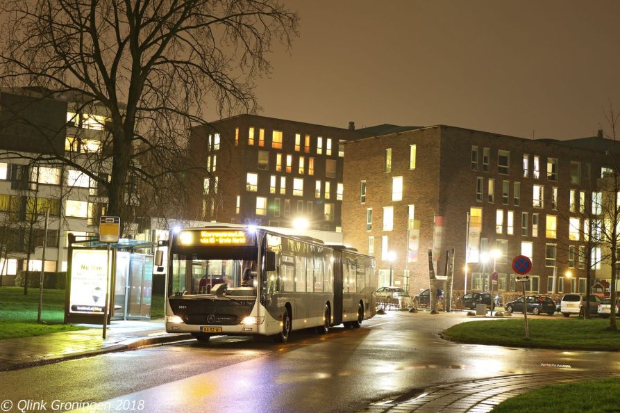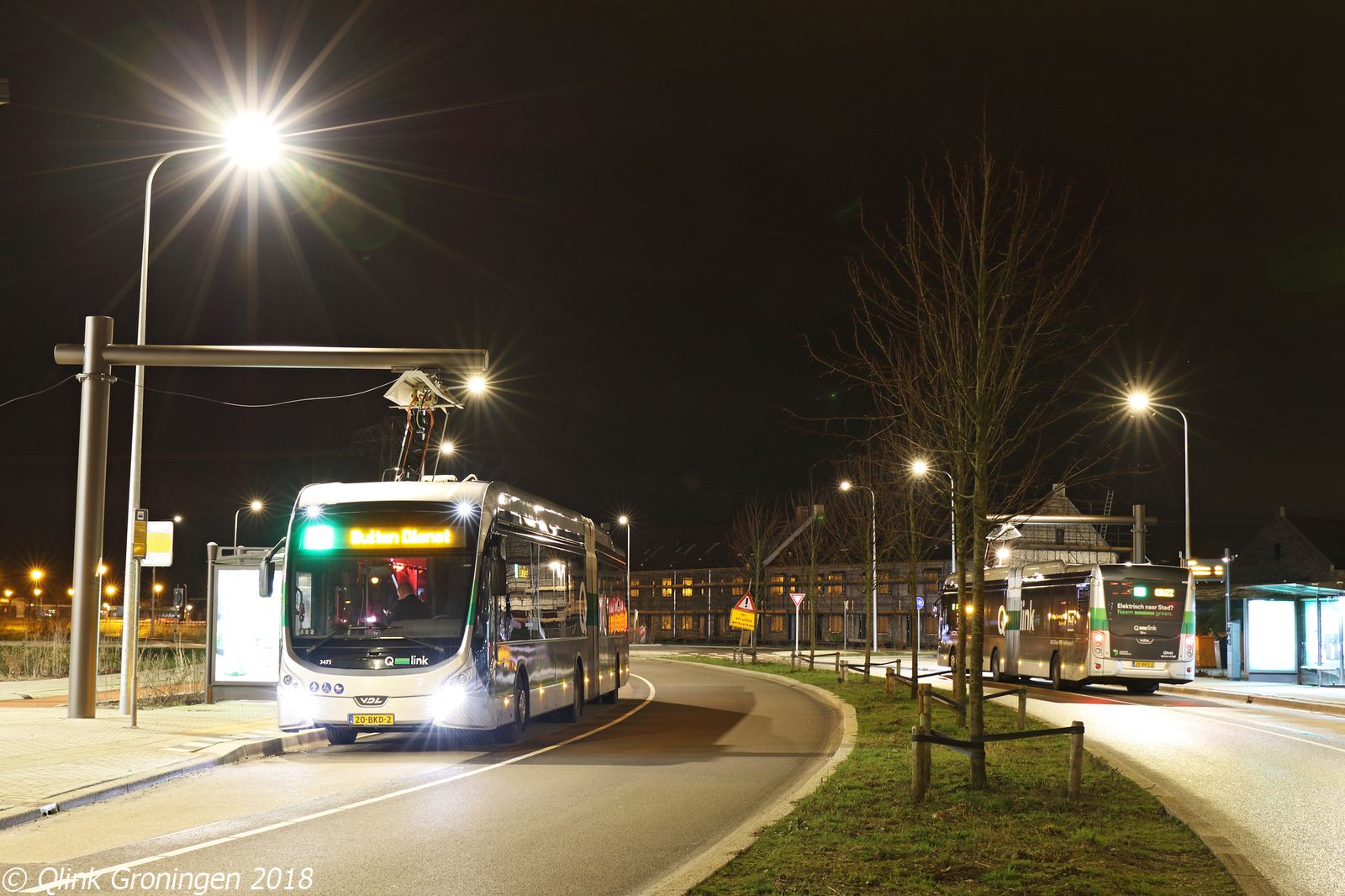 Op 4 februari 2018 werd na bijna drie jaar een vervolg gemaakt met de serie Q-link bussen in het donker. In deze drie jaar is het wagenpark van alle Q-link lijnen bijna veranderd. Eind vorig jaar stroomden 10 nieuwe elektrische bussen in op de beide Groene Q-link lijnen. In het begin waren er erg veel problemen met deze bussen, maar inmiddels zijn deze bijna allemaal verholpen. Op de foto staat bus 3473 bij één van de oplaadpunten bij P+R Retdiep en zou later gaan rijden als Q-link 1 naar het Hoofdstation.