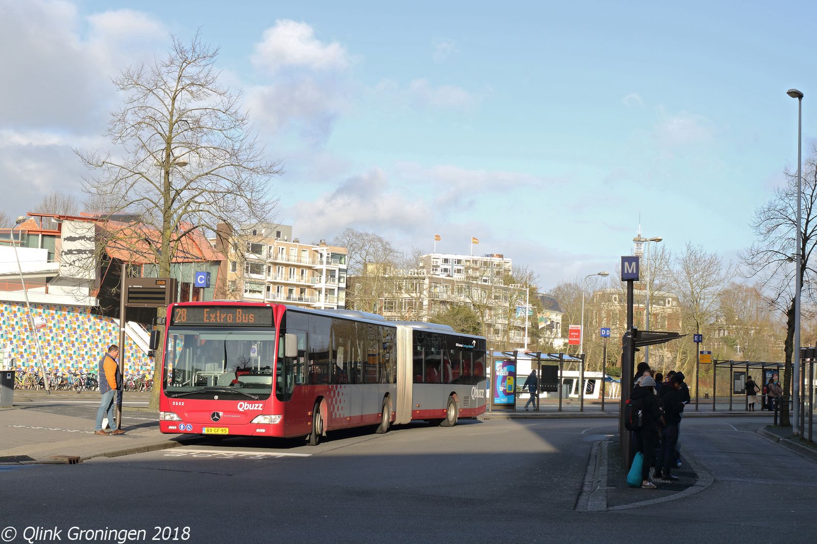 Sinds de dienstregelingswijzigingen in september 2017 reden op momenten dat er voetbalwedstrijden in de Euroborg waren bijna geen bussen meer naar het stadion toe. Dit kwam omdat Q-link 5 ging rijden naar P+R Meerstad en de diensten op het Europapark werden overgenomen door Q-link 2. Aangezien deze nieuwe lijn op tijden van de wedstrijden meestal niet rijdt, kwamen er een tweetal lijnen met pendelbussen voor voetbalwedstrijden. Lijn 28 volgt vanaf het Hoofdstation de oude route van Q-link 5 door de stad, terwijl de andere lijn met het nummer 27 vele wijken van de stad bediend. Op de foto staat bus 3502 gereed op het Hoofdstation om een rit te maken op lijn 28 en gaat zo supporters van FC Groningen naar de wedstrijd tegen ADO Den Haag brengen op 11 februari 2018.