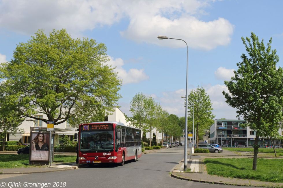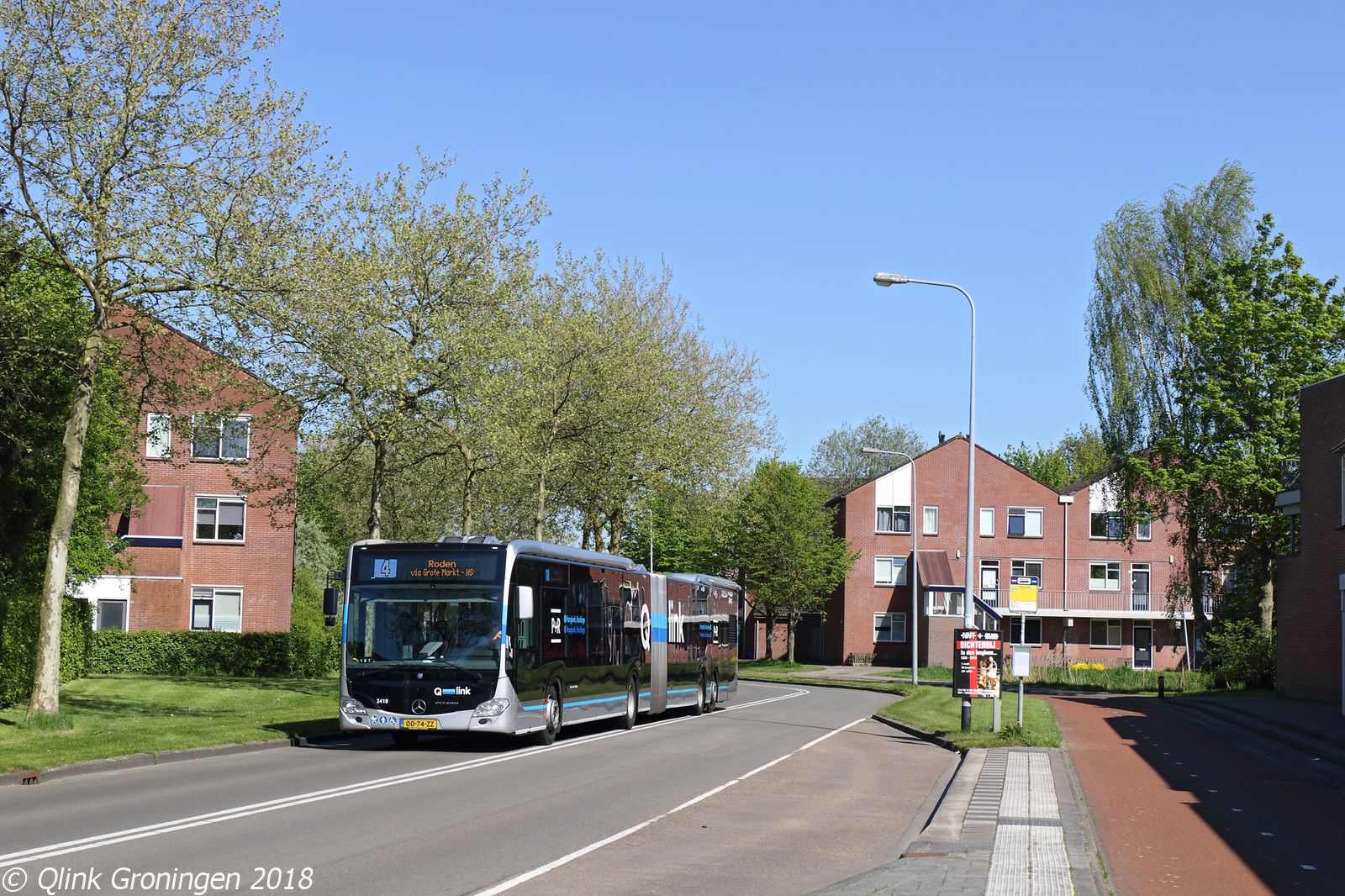 Door wegwerkzaamheden bij de haltes bij P+R Kardinge werden de bussen rond dit knooppunt ten oosten van Groningen omgeleid. De bussen werden onder andere in plaats van via de busbaan Oosterhamrikbaan omgeleid over de normale wegen rond Kardinge. Om weer op de busbaan te komen was ter hoogte van de halte Pop Dijkemaweg een tijdelijke doorsteek aangelegd, welke te zien is op de foto met bus 3446 die op 4 mei 2018 op weg is richting Roden als Q-link 4.