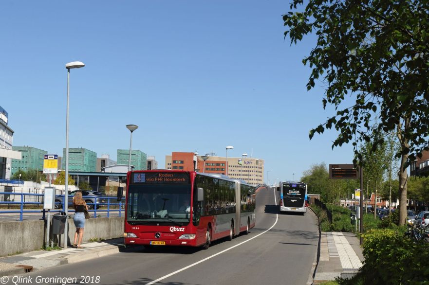 Wegens de grote toestroom op het stadspark wegens het jaarlijkse bevrijdingsfestival op 5 mei, werden er in 2018 weer de nodige extra bussen ingezet op de Q-link lijnen. De beide Q-link Blauw lijnen reden tussen Lewenborg/Beijum en P+R Hoogkerk elk 6 keer per uur. Omdat er niet voldoende Blauwe bussen beschikbaar waren, werden er ook rood-grijze bussen ingezet. Op de foto is de voormalig Emmer 3054 te zien, welke tot de komst van Q-link Rood aldaar verbleef en de stadslijn 12 voor zijn rekening nam. Op de foto halteert de bus bij de halte Paterswoldseweg en is als Q-link 4 op weg richting Roden.