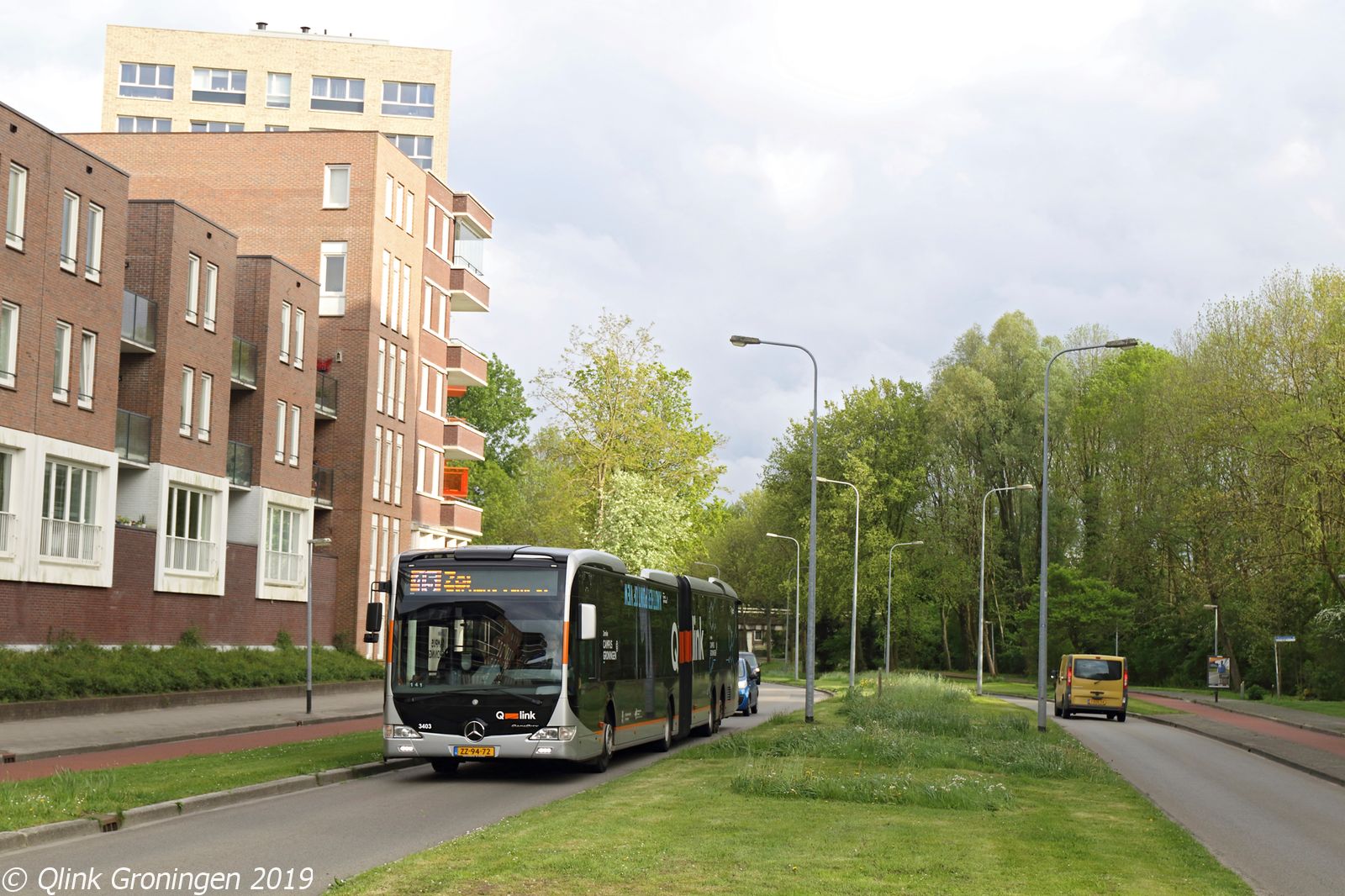 In de meivakantie van 2019 keerde Q-link 15 grotendeels terug op zijn oude route, die het reed voor het Q-link tijdperk. Deze route vanaf de Westerhaven via de Prinsesseweg en Zonnelaan werd destijds grotendeels overgenomen door stadslijn 9, en Q-link 15 werd hierbij over de westelijke ringweg gestuurd. Wegens werkzaamheden aan de laatstgenoemde ringweg werd Q-link 15 teruggestuurd naar zijn oude route. Op de foto passeert bus 3403 de fotograaf op het eerste stuk van de Zonnelaan en is als Q-link op weg richting Zernike. Normaal zijn de Capacity-bussen nooit op deze locatie te zien.