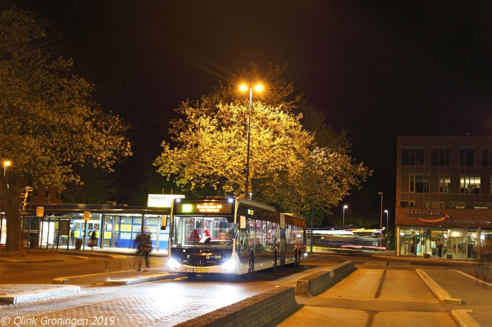Op Bevrijdingsdag 2019 werden vanwege de vele bevrijdingsfestivals en de daarbij behorende extra reizigers diverse extra bussen ingezet op verschillende buslijnen. Op verschillende Q-link lijnen werden extra bussen ingezet om de reizigers te vervoeren. Ook werden in de avonduren enkele Q-link bussen op Q-linerlijnen ingezet omdat er niet genoeg Q-linerbussen beschikbaar waren. Een bijzondere inzet was de inzet van twee ritten op Q-linerlijn 300 tussen Groningen en Emmen, gereden met een Capacity L van Q-link Blauw. Op de foto staat bus 3411 gereed op het Station in Emmen, klaar om als Q-liner 300 weer richting Groningen te vertrekken op 5 mei 2019.