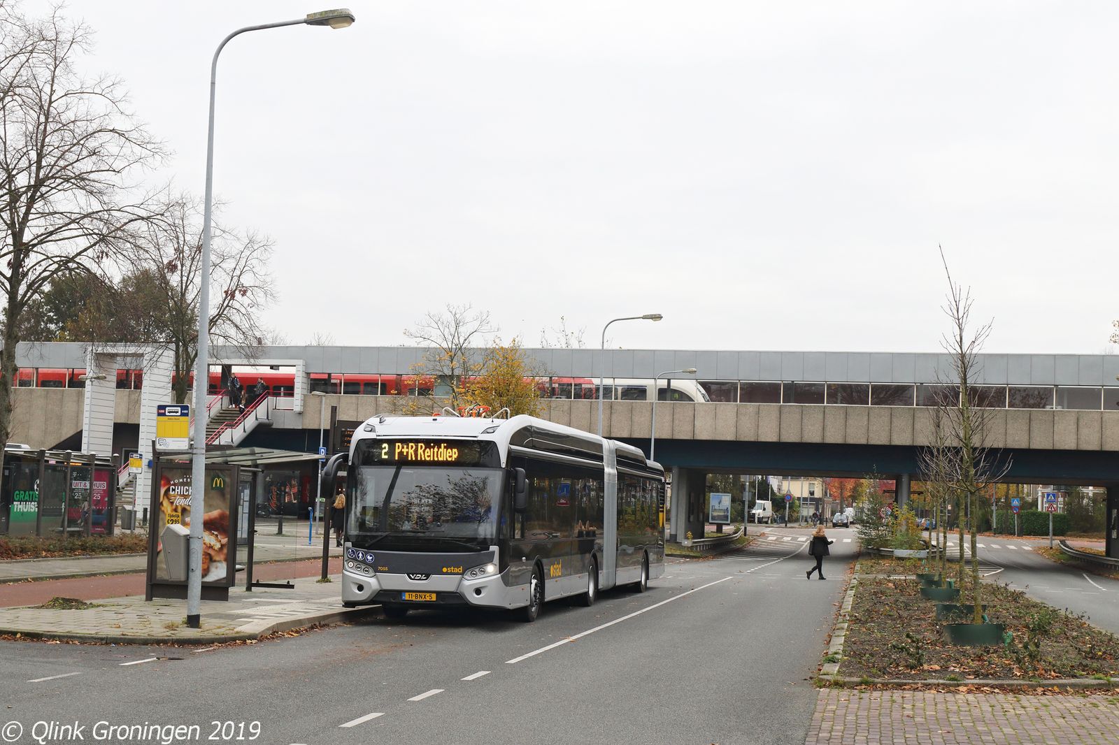 Nadat de nieuwe gelede stadsbus op Station Europapark had gekeerd om weer richting P+R Reitdiep te gaan, werd nog een foto gemaakt bij Station Noord. Hier kunnen reizigers uit de richting Roodeschool en Delfzijl richting Zernike overstappen op Q-link Groen. De nieuwe stadsbus reed de hele dag op 11 november 2019 op Q-link 2. Op de foto is bus 7055 te zien bij de halte als hij de reizigers laat instappen om ze richting P+R Reitdiep te brengen.