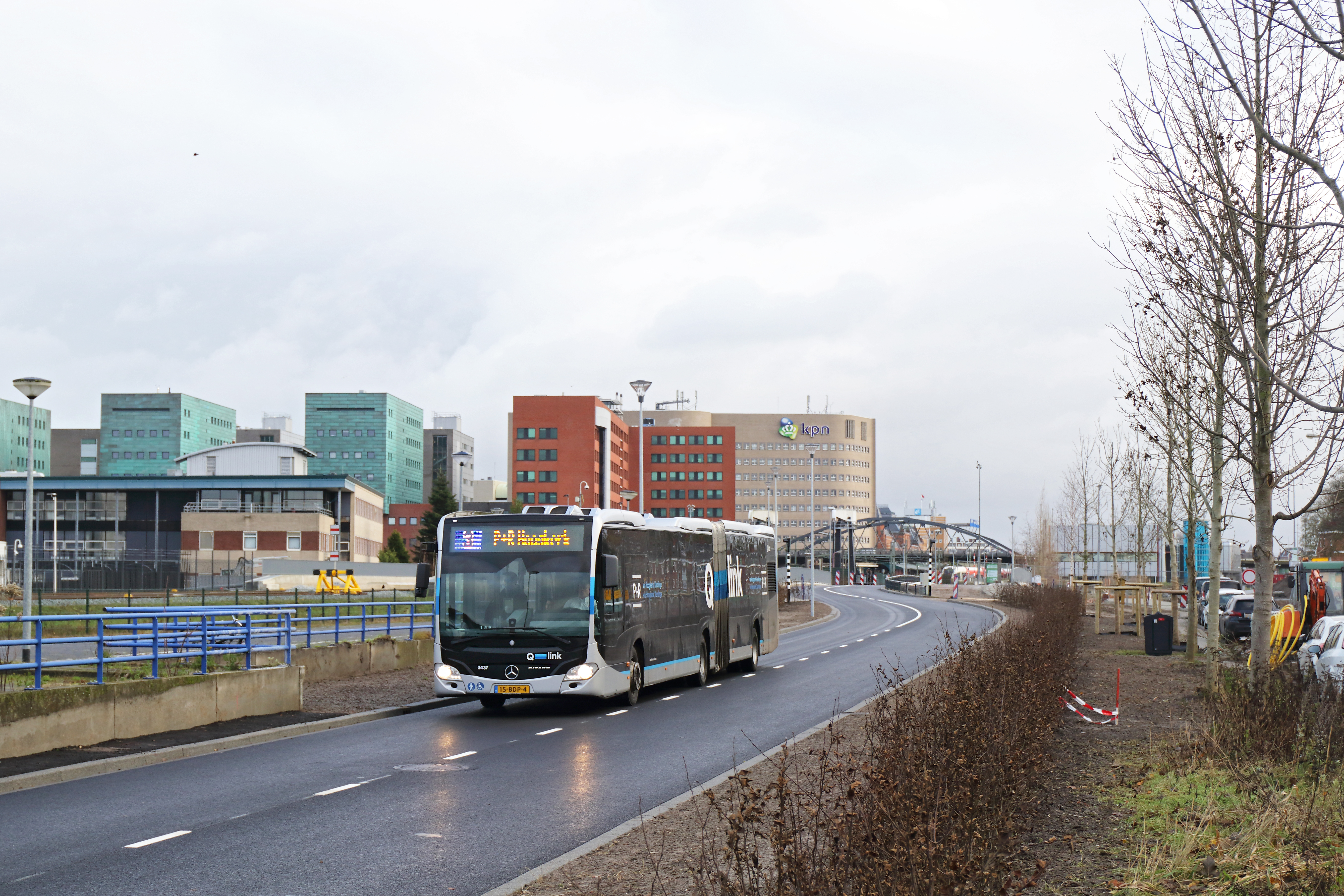 Eind november 2019 werd afscheid genomen van de tijdelijke busbrug over de Paterswoldseweg in Groningen, en werd deze vervangen door het definitieve viaduct waar sinds oktober 2018 aan werd gebouwd. Ook de halte Paterswoldseweg zou worden verplaatst en op 15 december 2019 in gebruik worden genomen. Op de foto is bus 3437 net dit nieuwe viaduct gepasseerd en op weg als Q-link 3 richting P+R Hoogkerk op 7 december 2019.