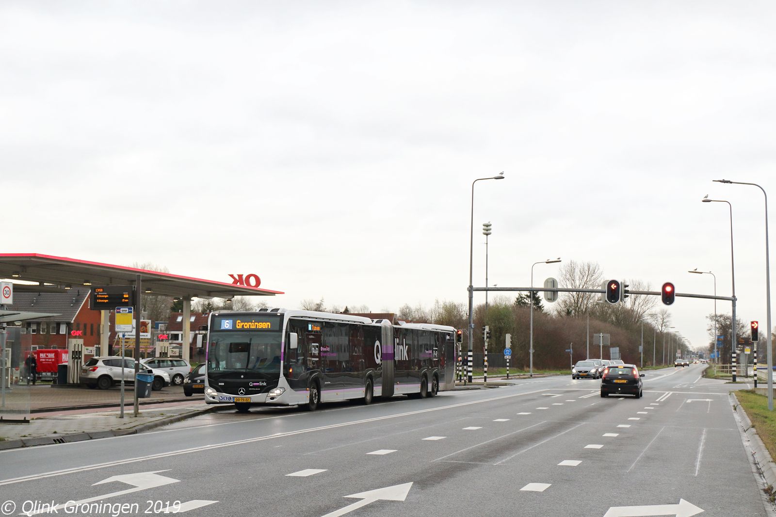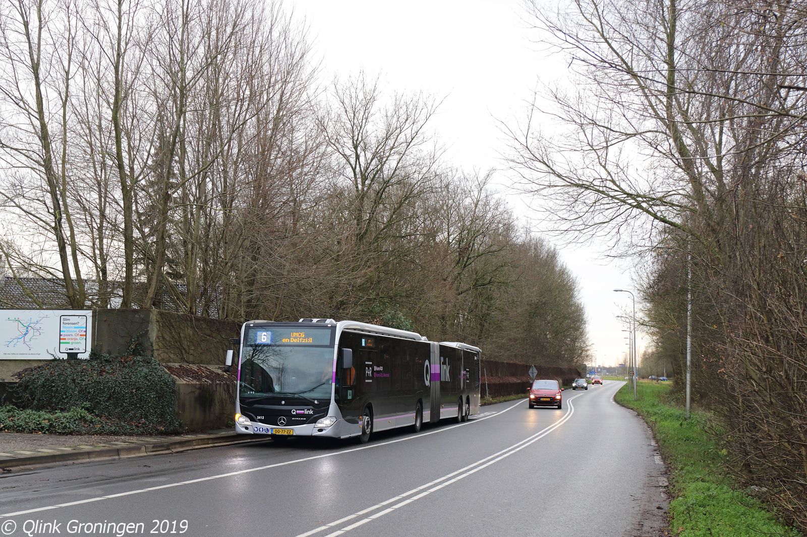 Eerder werden de Capacity L-bussen in hun nieuwe paarse uitvoering op diverse plekken gefotografeerd, maar eigenlijk niet op de belangrijkste weg waar deze bussen over heen rijden. Namelijk de N360 tussen Groningen en Appingedam, waarbij Q-link 6 diverse plaatsen passeert. Op de foto is de Capacity 3409 helemaal thuis op zijn nieuwe route als hij aan het einde van de N360 halt houdt bij de halte Ruischerwaard en zo op 21 december 2019 op weg gaat richting het Hoofdstation als Q-link 6.
