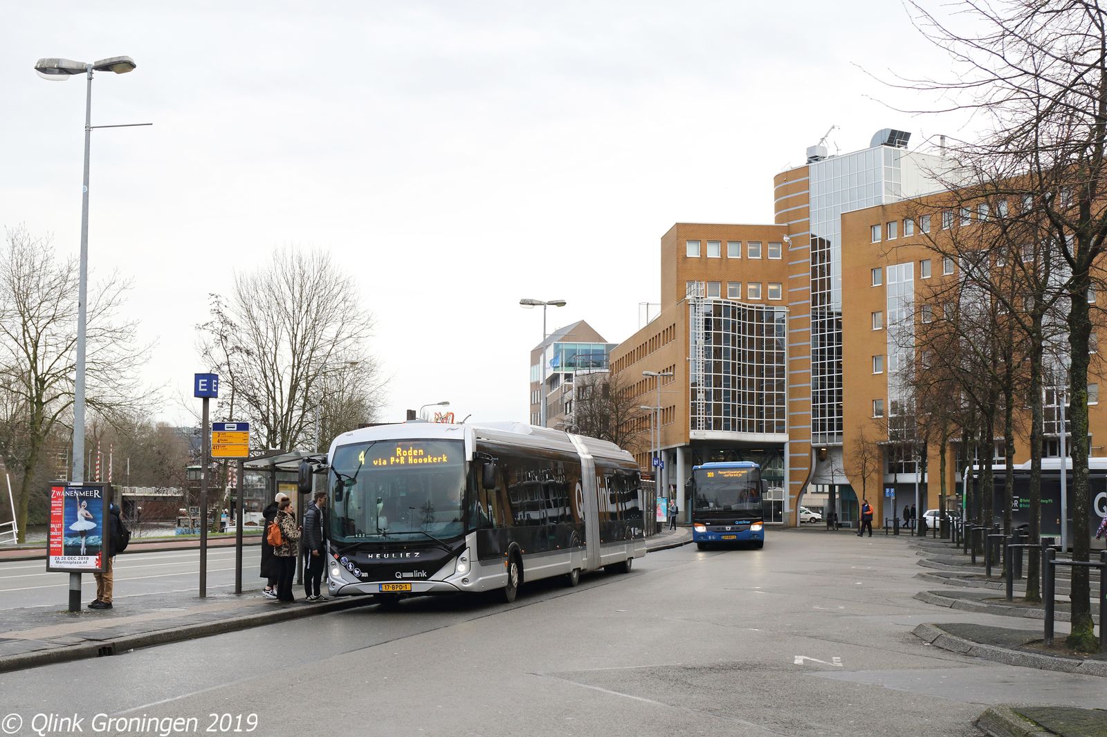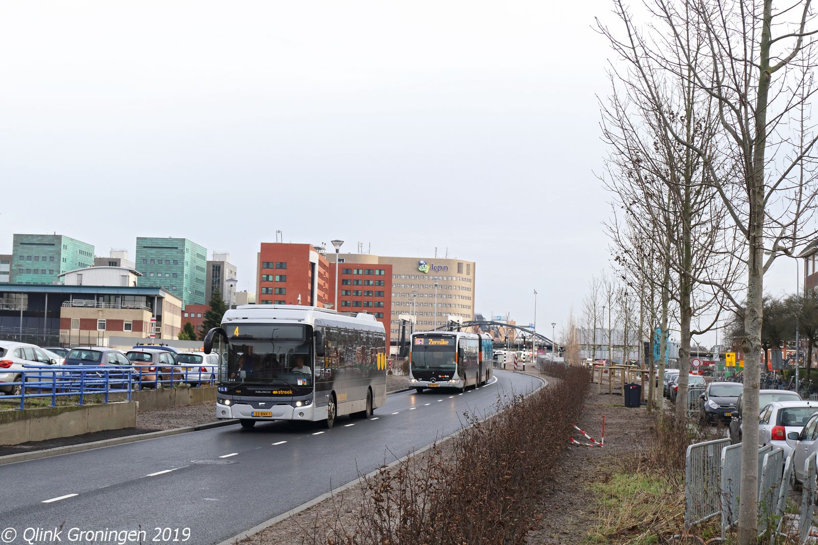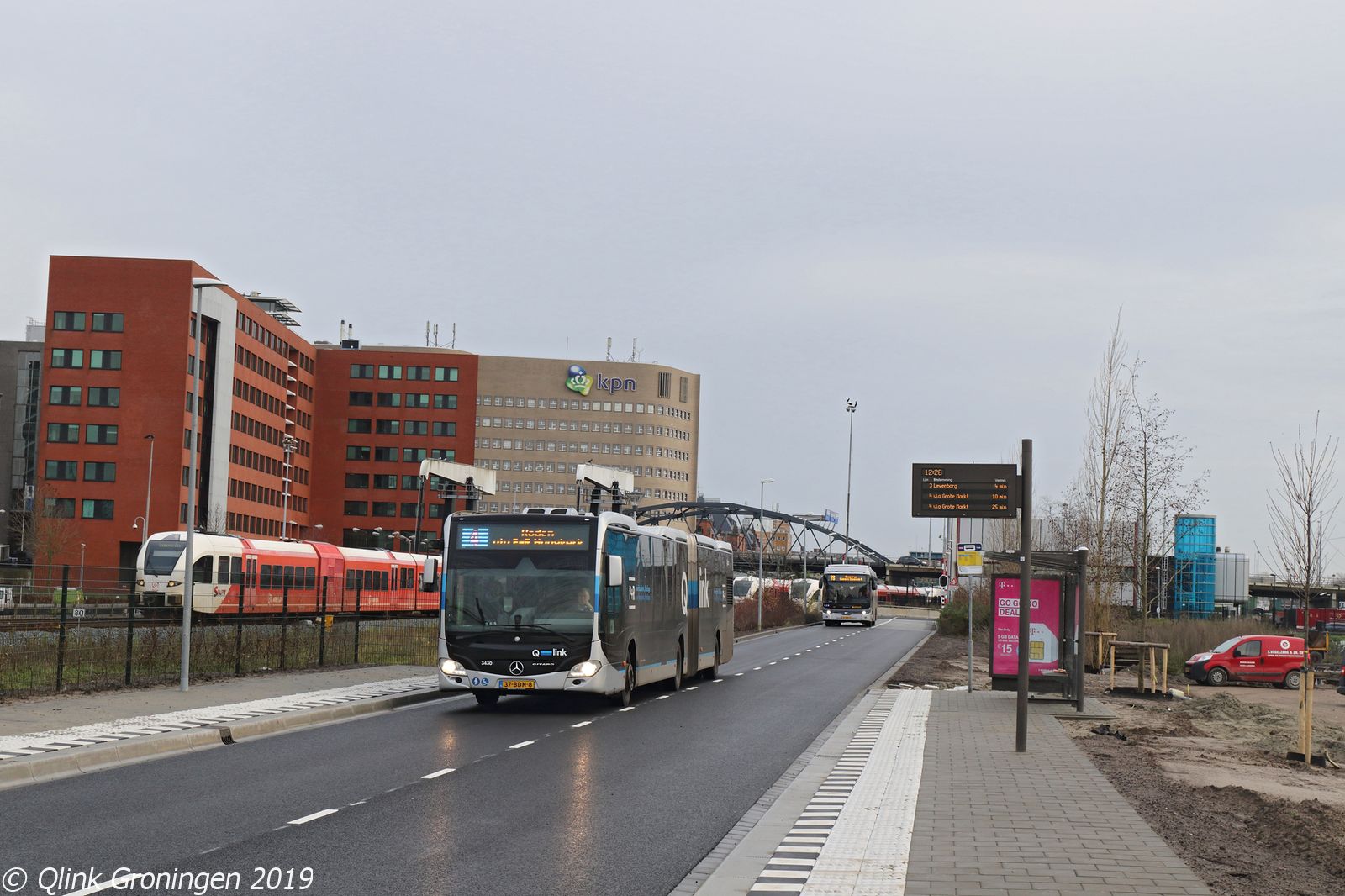 Met de start van de nieuwe dienstregeling op 15 december 2019 werd de nieuwe halte Paterswoldseweg aan de route van Q-link Blauw in gebruik genomen. Deze halte werd verplaatst richting het Hoofdstation en net voorbij het nieuwe viaduct. Omdat nog niet alle nieuwe Heuliez-bussen tijdig zijn gearriveerd, is het nog mogelijk om hier nog de diesel Q-link Blauw bussen te fotograferen. Op de foto passeert dan ook bus 3430 de halte Paterswoldseweg en is op weg als Q-link 4 richting Roden.