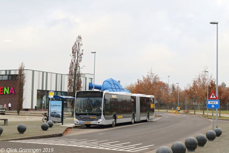 De nieuwe gelede streekbus 7508 reed eerder al op Q-link Blauw en Oranje, maar belandde op 6 december 2019 op Q-link 5 en 6. Hij werd hier ingezet om de laatste modificaties te doen aan de Q-link Paars Citaro G C2 bussen die straks alleen nog op Q-link 6 te zien zijn. Q-link 5 zou in de loop van 2020 echter volledig met elektrische bussen worden gereden, en de inzet van deze streekbussen zou dan ook maar van korte duur zijn. Op de foto is deze bus te zien terwijl hij het kerkje van Middelbert passeert en op weg is richting Harkstede.