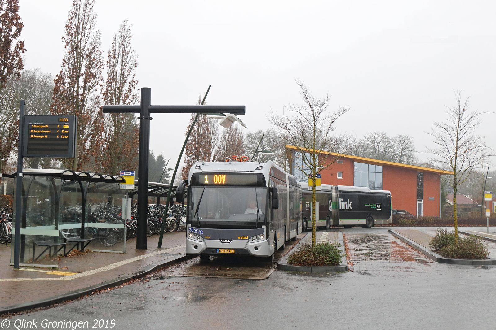Naast op Q-link 2 reden de nieuwe gelede stadsbussen ook op Q-link 1 hun rondjes. Dit omdat de eigenlijke elektrische Q-link Groen bussen de laatste wijzigingen moesten ondergaan voor de nieuwe concessie die op 15 december 2019 inging. Met ingang van deze concessie zou Q-link 1 echter nog tot P+R Reitdiep gaan rijden, en het stuk naar Zuidhorn zou worden vervangen door Q-link 2. Daardoor is het maar korte tijd mogelijk geweest de nieuwe gelede stadsbussen in Zuidhorn te zien op Q-link 1. Op de foto is bus 7050 te zien onder de laadpaal bij Station Zuidhorn als hij straks als Q-link 1 op weg gaat richting Hoofdstation op 6 december 2019.