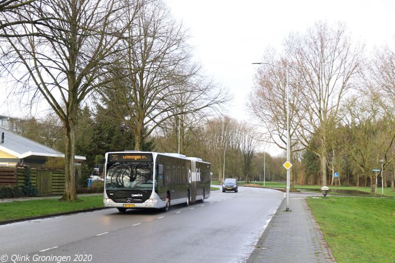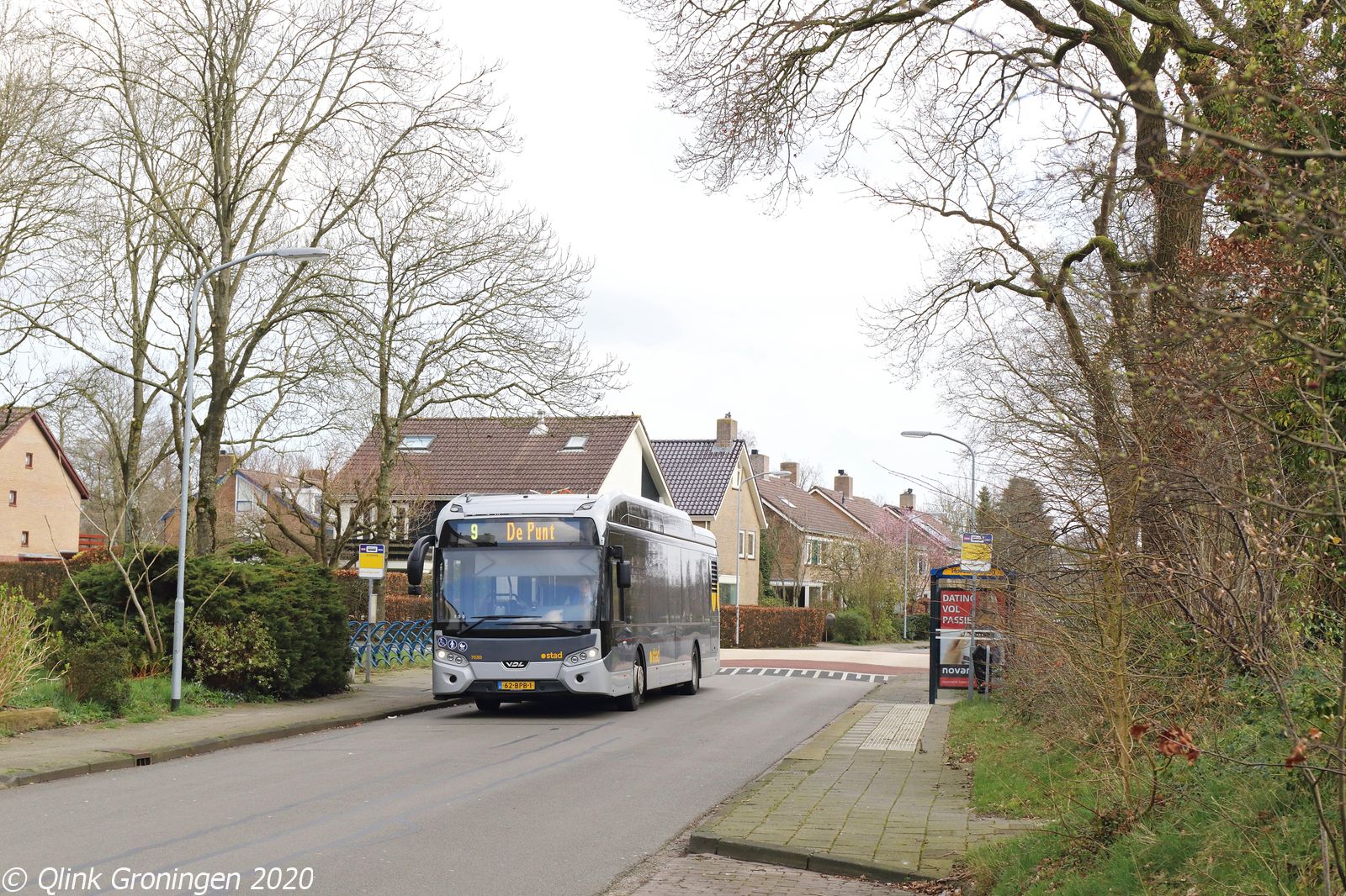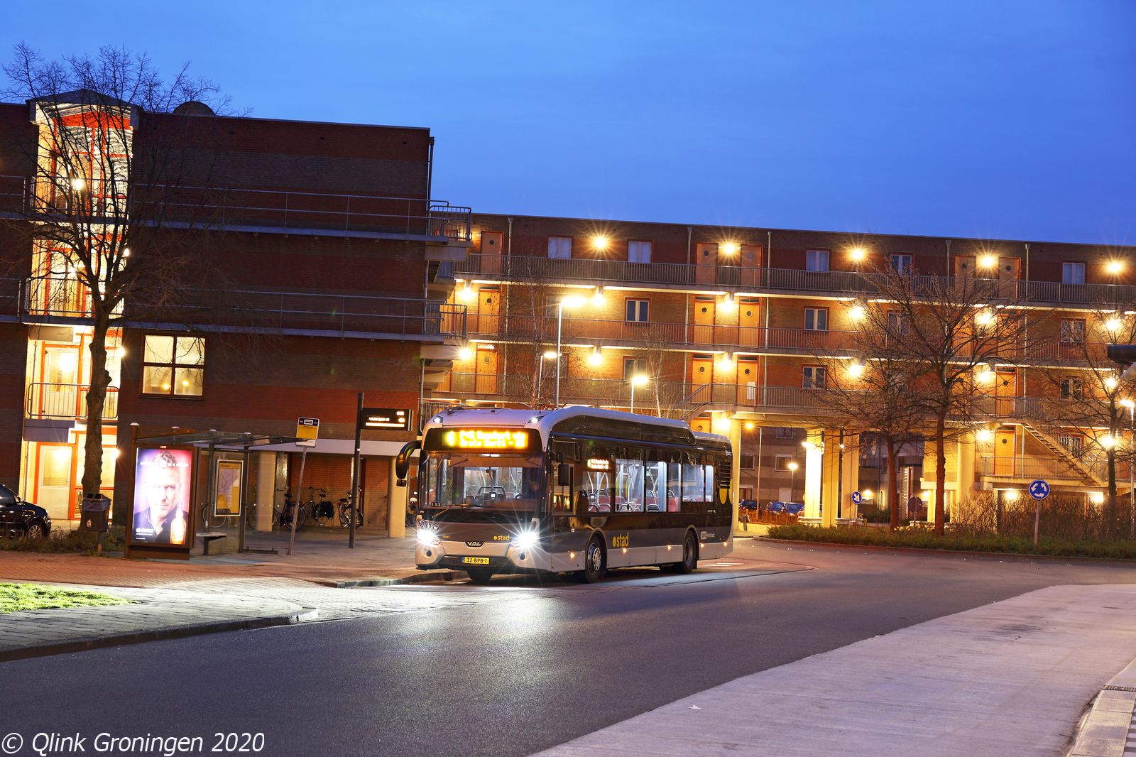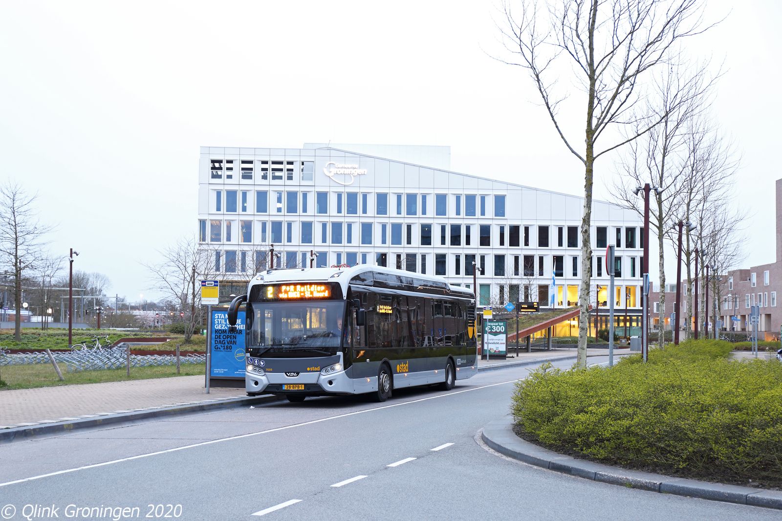 Vanwege de coronacrisis rijden de Q-link-lijnen doordeweeks volgens de dienstregeling die normaal op zaterdag geldt. Dit komt door overheidsmaatregelen, waaronder het ontbreken van scholieren en het vele thuiswerken. Om mensen in de vroege ochtend toch naar cruciale plekken zoals ziekenhuizen te vervoeren, rijden er ’s ochtends vroeg enkele extra ritten bovenop de zaterdagdienstregeling. Op Q-link 4 reed in de eerste week een rit van Roden naar Beijum en terug naar P+R Hoogkerk. Deze ritten werden uitgevoerd met een 12m VDL elektrische stadsbus in plaats van een Heuliez-bus. Op de foto is bus 7007 te zien op het beginpunt Wibenaheerd in Beijum en zou zo op 20 maart 2020 op weg gaan naar P+R Hoogkerk.