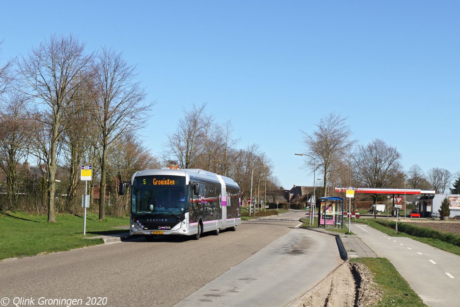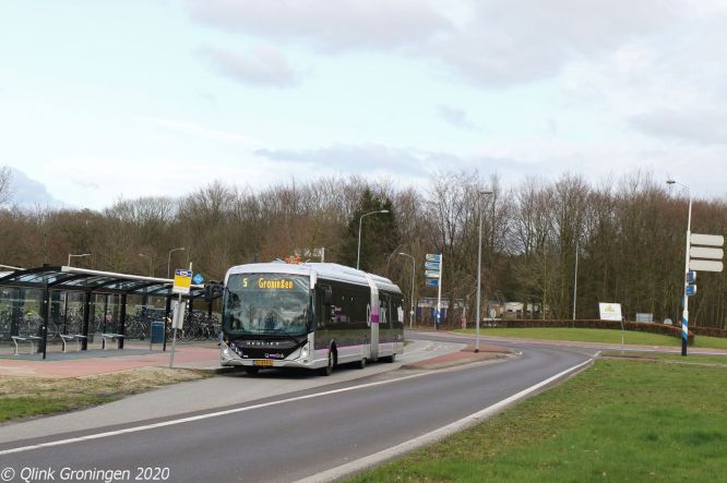 Eerder verscheen al een elektrische Heuliez Q-link Paars op Q-link 5, maar deze bussen kregen al snel Blauwe Q-link-stickers. Voor bus 7415 geldt dit niet; deze rijdt al geruime tijd in zijn Q-link Paarse jasje op Q-link Blauw. Op 16 maart 2020 kwam deze bus echter op zijn bedoelde lijn terecht, wat eigenlijk nog steeds niet mogelijk is vanwege het ontbreken van oplaadfaciliteiten in Annen. Op de foto is de bus te zien terwijl hij vertrekt vanaf de halte P+R Westlaren en op weg is als Q-link 5 richting Groningen en Tersluis.