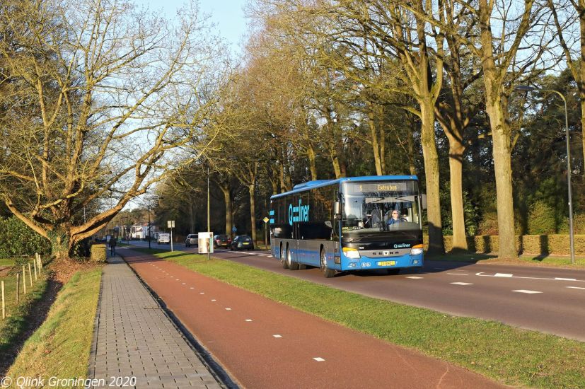 Qbuzz rijdt vanwege de coronacrisis een zaterdagdienstregeling op de Q-link-lijnen met diverse extra ritten in de ochtend. Hierdoor is het mogelijk dat materieel wordt ingezet dat normaal gesproken niet op de Q-link-lijnen te zien is. Sinds de tweede week van de crisis rijdt er een extra rit op Q-link 5, die om 6.55 uur vertrekt vanuit het Hoofdstation en slechts tot Zuidlaren Brink rijdt, om vervolgens terug te keren naar Groningen UMCG. Deze rit, uitgevoerd met een Q-liner van 15 meter, bus 7639, passeert hier de fotograaf op de Stationsweg in Zuidlaren en is op 23 maart 2020 op weg naar de Brink in Zuidlaren.