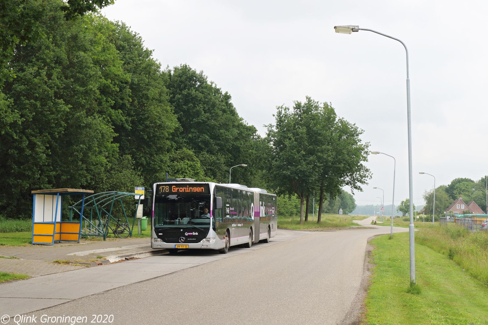 Aan het einde van de tweede week begonnen ook de oude Q-link Paarse bussen op de omlopen in Groningen te rijden, in tegenstelling tot de eerder ingezette euro 6 bussen. Daardoor waren de bussen ook meer te zien in het Groningerland en dichterbij hun oude inzetgebied. Op de foto staat bus 3051 gereed bij het beginpunt Leeuwerikhoogte van lijn 178 in Siddeburen en zou na een korte haltering lijn 178 tussen Siddeburen en Groningen gaan rijden op 12 juni 2020.
