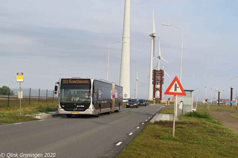 Een van de opmerkelijkste inzetten van de oude Q-link Paarse bussen is op lijn 160 van Groningen naar de Eemshaven. Deze lijn is in december 2019 geïntroduceerd ten tijde van de nieuwe concessie. Dit was tevens het moment waarop deze bussen uit dienst hadden moeten gaan en dus nooit op deze lijn zouden rijden. Op de foto passeert bus 3051 de fotograaf op 19 juni 2020 bij de halte Emmahaven op de Kwelderweg in de Eemshaven en is op weg naar het eindpunt bij het datacenter van Google.