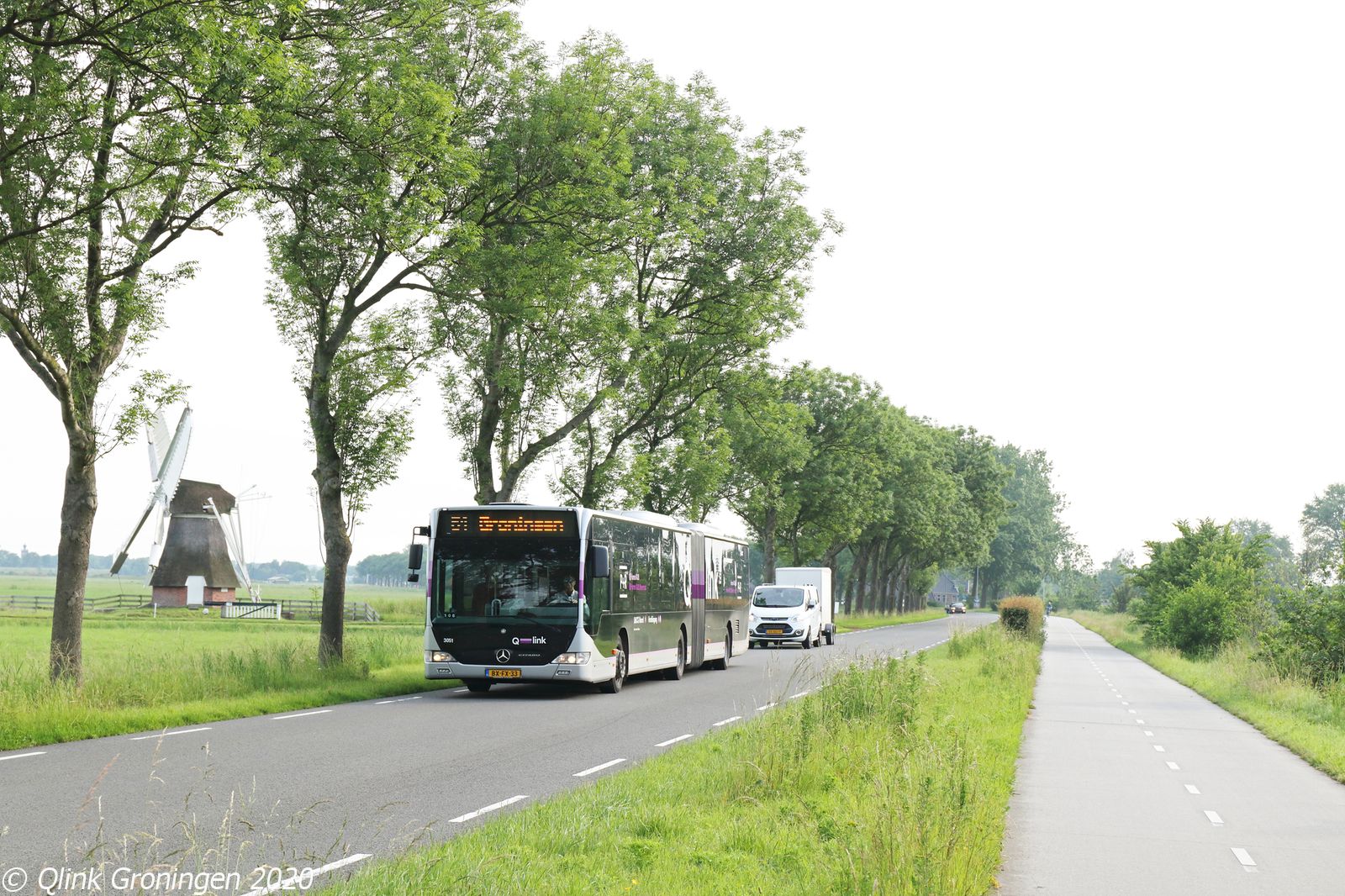 Na lijn 45 rijdt de bus vanuit Middelstum verder op lijn 61 richting Groningen via Bedum en Onderdendam. Vlak voordat hij de stad Groningen bereikt, rijdt lijn 61 zoals eerder gemeld langs de molen Witte Lam. Deze poldermolen staat al sinds 1860 deze polder leeg te pompen. Op de foto passeert bus 3051 de fotograaf bij de molen en is als lijn 61 op weg naar Groningen op 19 juni 2020, om daarna nog een rit naar Uithuizen te maken op dezelfde lijn.
