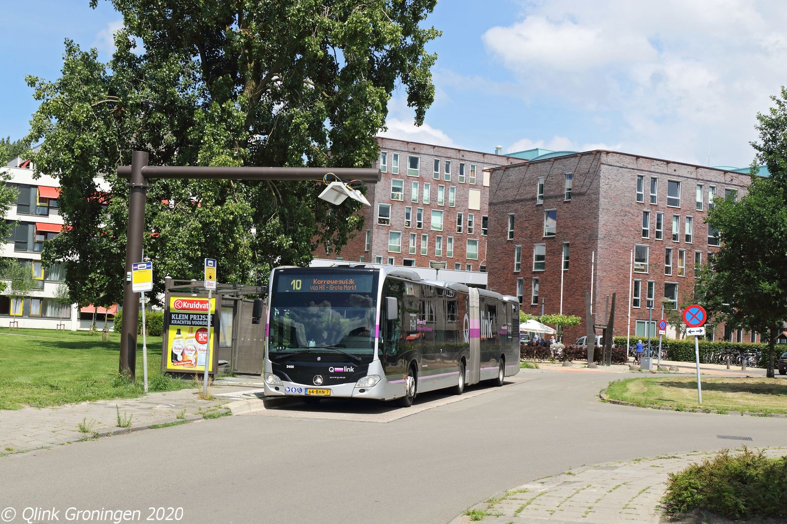 Nadat een paar weken eerder Q-link reservebus 3458 op lijn 10 in de stad Groningen was verschenen, was het op 20 juni 2020 samen met de 3458 de beurt aan bus 3456 in de Paarse Q-link bussen. Deze bussen, die normaal alleen op Q-link 6 rijden, zijn dan ook een ongebruikelijke verschijning in de wijken van de stad. Op de foto is bus 3456 te zien terwijl hij onder de oplaadpaal bij de Hoornsemeer doorrijdt om zo verder te gaan richting de Korrewegwijk.