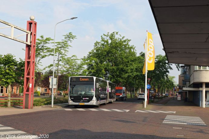 Op 3 juni 2020 werd als eerste halt gehouden in Musselkanaal, waar op dit moment diverse ritten op de lijnen 73 en 74 met Q-link bussen worden gereden. Op lijn 74 rijdt in de vroege ochtend eerst een Q-link Rode bus uit Veendam, waarna deze een uur later wordt gevolgd door een oude Q-link Paarse bus. Op de foto vertrekt bus 3096 bij de halte Willem Diemerstraat in het centrum van Musselkanaal en is op weg via Valthermond naar Emmen op lijn 74.