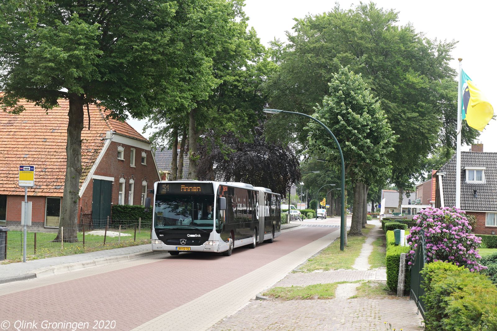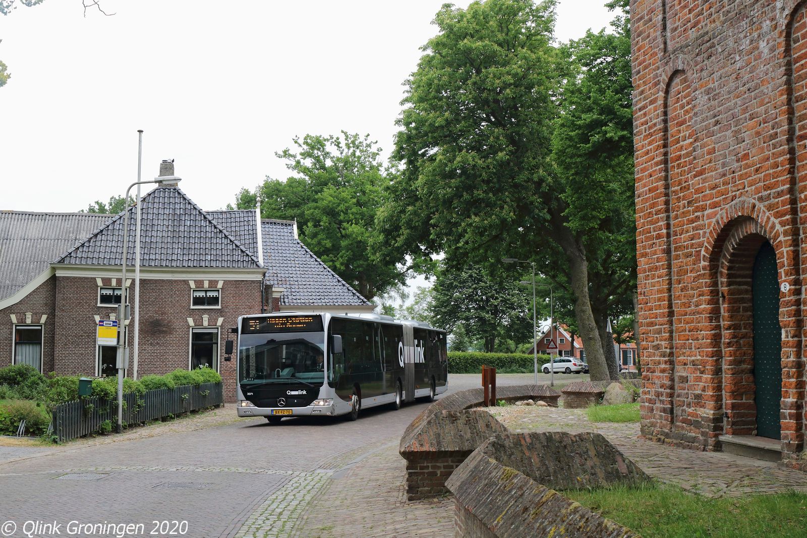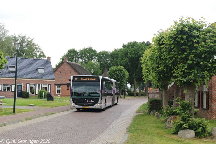 Na de foto in De Punt werd doorgereden naar het pittoreske Noordlaren, waar lijn 51 één slagje per dag doorheen rijdt met een oude Paarse Q-link bus. In dit dorp met een zeer fraaie Bartholemeuskerk, rechts op de foto, is tevens het enige hunebed van de provincie Groningen te vinden. Op de foto rijdt bus 3067 voorbij de halte Lageweg en is als lijn 51 via Zuidlaren en Annen op 10 juni 2020 op weg naar Assen.