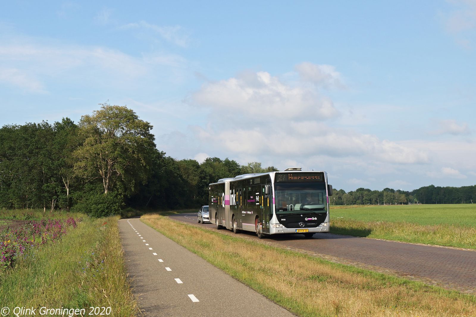 Op 11 juni 2020 werd afgereisd naar het kleine Drentse esdorpje Gees, waar lijn 27 tussen Emmen en Hoogeveen al jaren doorheen rijdt. Vlak voor dit plaatsje ligt een prachtig mooie klinkerweg waar de lijn vanuit Oosterhesselen overheen tuft. Op slechts één rit per dag rijdt op deze lijn op dit moment een Q-link Paarse bus. Deze vertrekt om 18:01 uit Emmen en gaat dan op weg naar Hoogeveen, zo ook op de foto als bus 3058 de fotograaf passeert op de Geserweg en op weg is naar Hoogeveen.