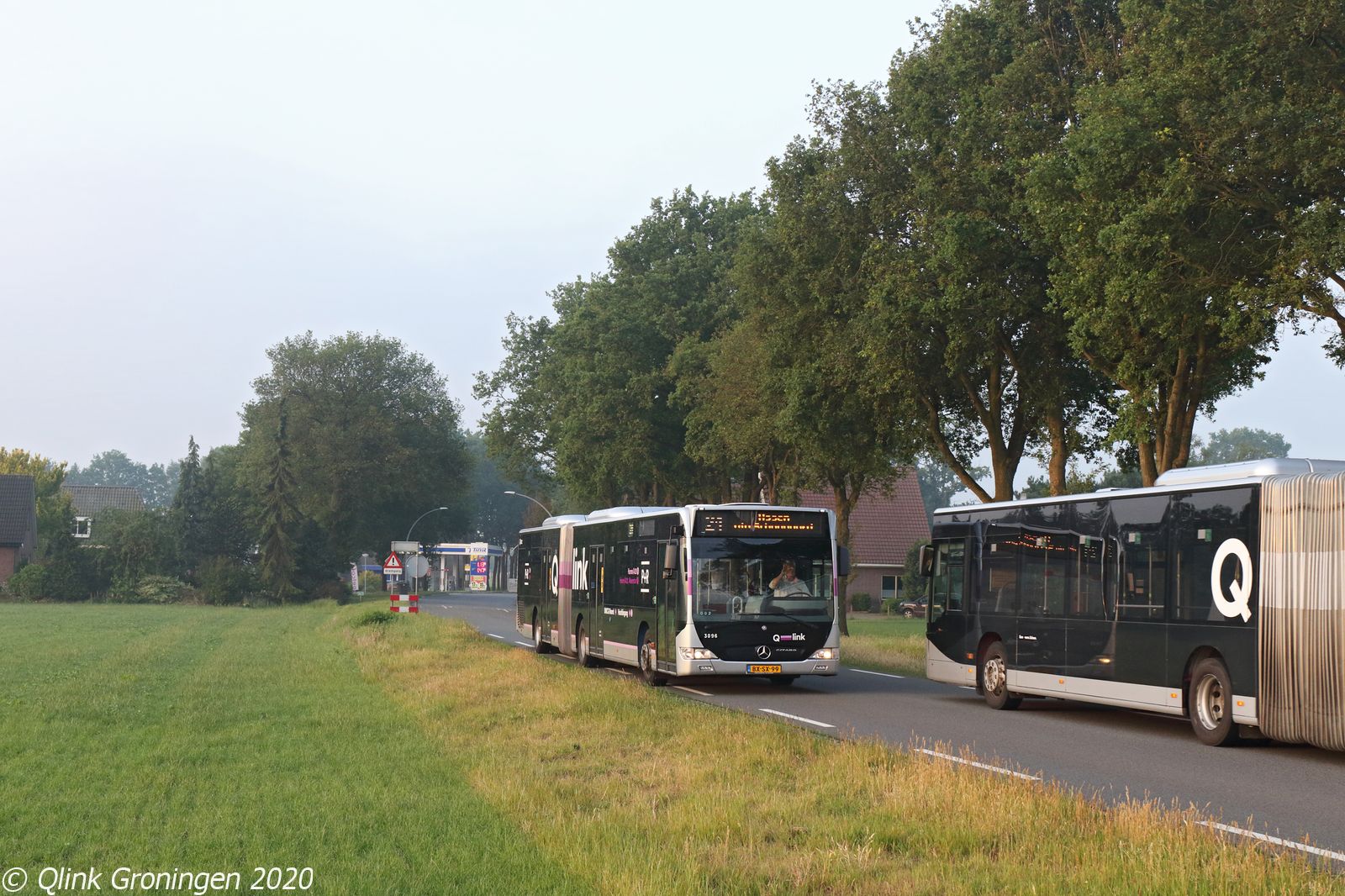 Een dag later werd afgereisd naar de route van lijn 21 tussen Emmen en Assen, waar twee ritten per dag vanuit Emmen naar Assen rijden en één vanuit Assen naar Emmen met oude Q-link bussen wordt uitgevoerd in de vroege ochtend. Op de foto is dan ook een erg bijzondere kruising die maar ééns per dag mogelijk is op deze lijn, namelijk twee oude Q-link bussen die elkaar in de vroege ochtend tegenkomen rond het plaatsje Erm. Q-link Paarse bus 3096 is op weg als lijn 21 naar Assen zojuist Erm verlaten, terwijl bus 3067 op 12 juni 2020 op weg is naar Emmen op lijn 21.