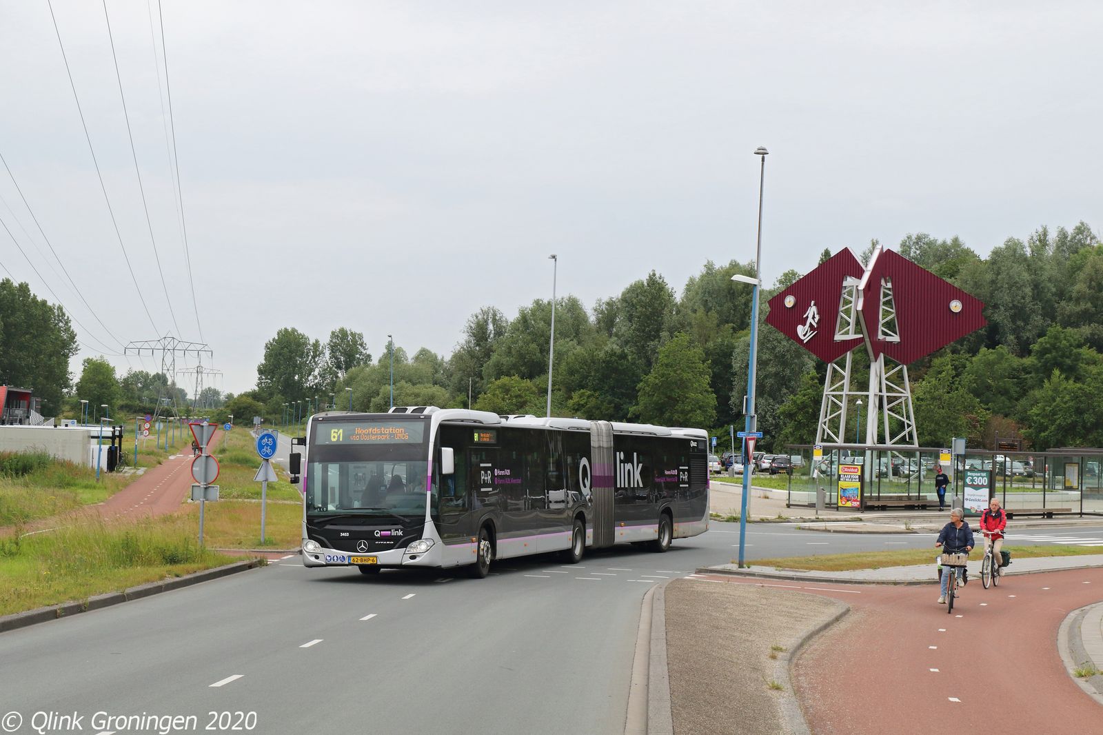 Zoals eerder vermeld reden in de eerste twee weken van de introductie van de oude Q-link Paarse bussen op de streekdiensten vooral de nieuwe Euro 6 dieselbussen van Q-link 6 op deze omlopen. Hierdoor waren deze bussen op lijnen te zien waar ze normaal gesproken niet te vinden zijn, zoals op de route van lijn 61 tussen Uithuizen en Groningen. Op het laatste stuk van de route deelt deze lijn deels de route met Q-link Blauw, waardoor deze bus een extra bijzonderheid is. Op de foto komt bus 3453 de bocht om bij Kardinge en is als lijn 61 op weg richting het Hoofdstation op 10 juni 2020.