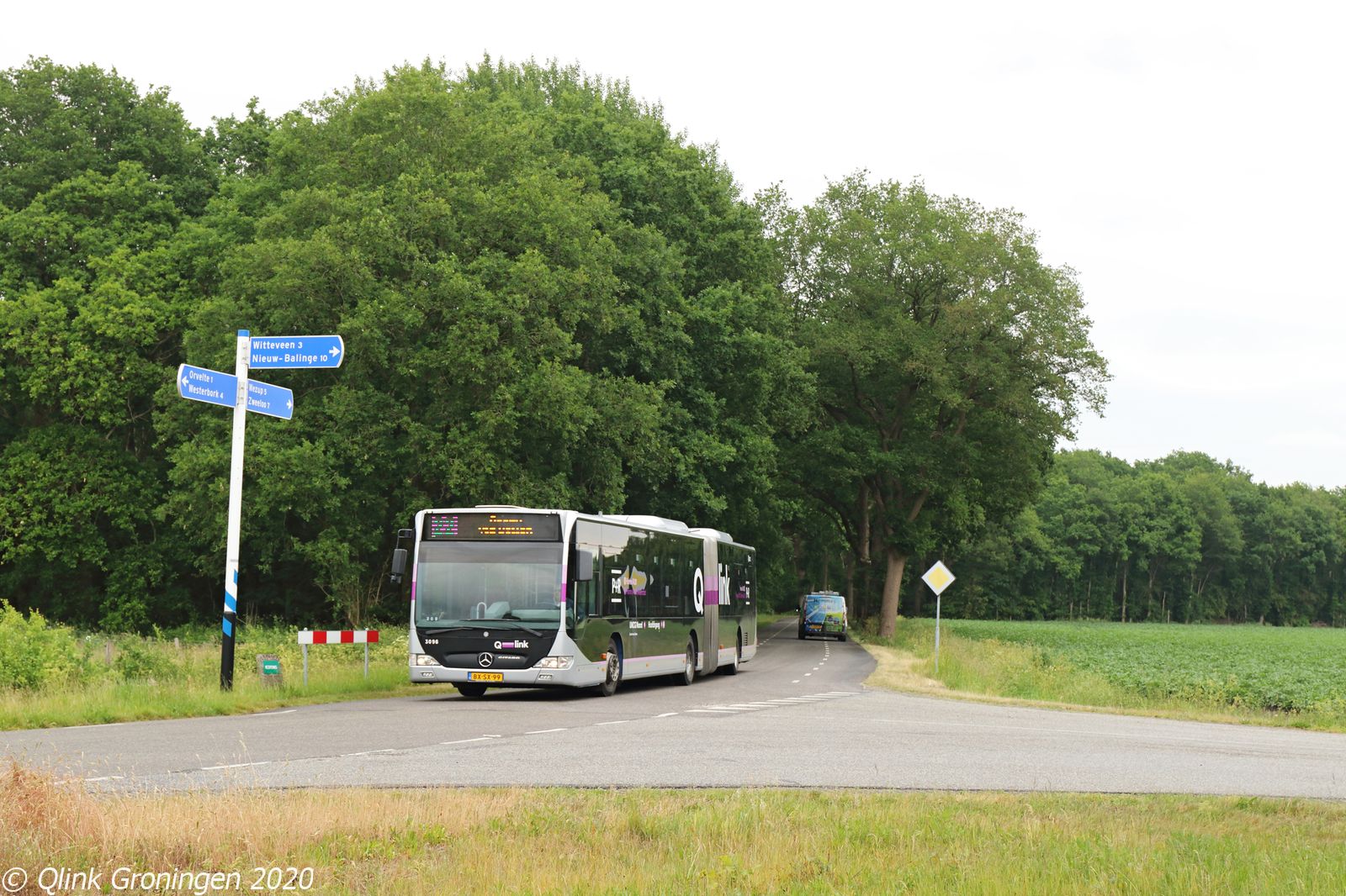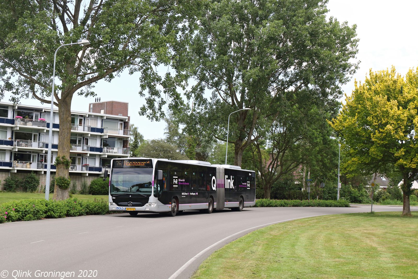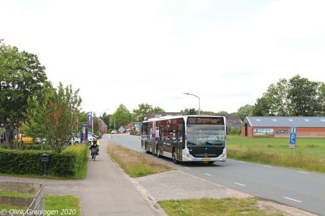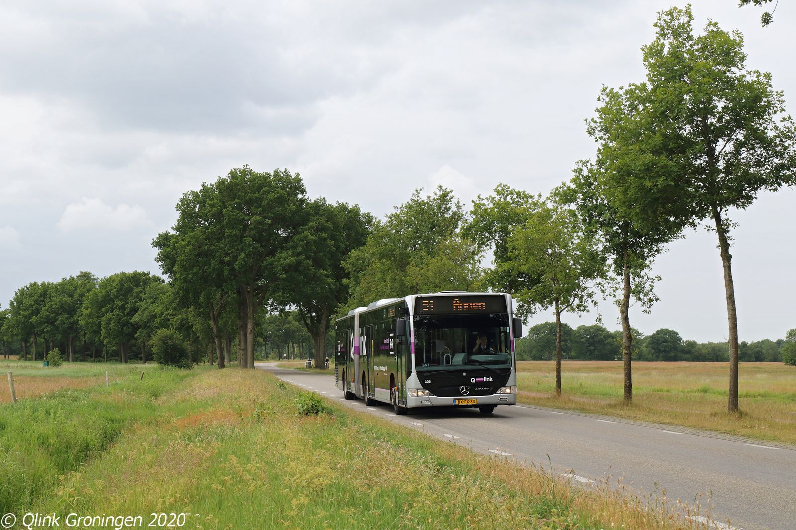 Op 6 juni 2020 werd voor het eerst een oude Q-link Paars bus ingezet op de reguliere streekomloop vanuit de stalling in Appingedam. Hierdoor reden deze bussen op andere lijnen dan gebruikelijk, vooral in Drenthe. Op de foto rijdt bus 3052, die een week eerder op Q-link 6 reed, op lijn 133 van Surhuisterveen naar Groningen. De foto is genomen net na vertrek uit Grootegast.