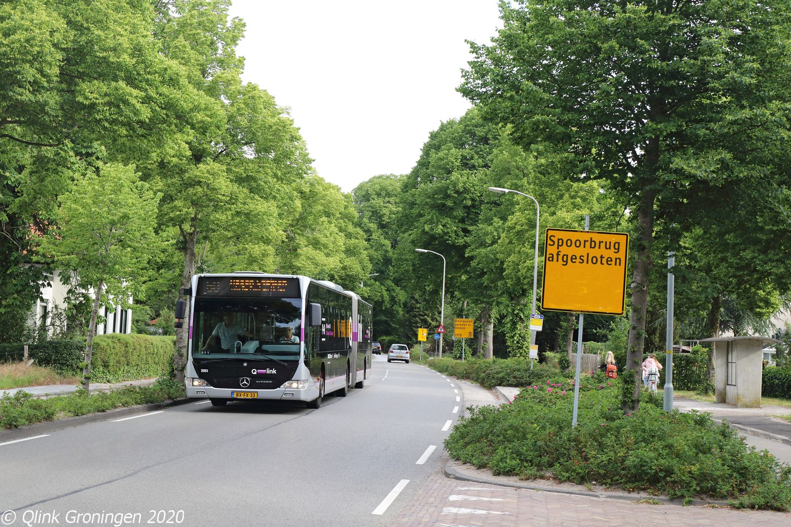 Vanwege de coronamaatregelen moeten alle OV-reizigers buiten de bussen anderhalve meter afstand houden. Het Hoofdstation in de stad Groningen is daarom tijdelijk uitgebreid om deze gewenste afstand te waarborgen. Hierdoor zijn de Q-link lijnen 3 tot en met 5 verplaatst naar plaatsen ten zuiden en oosten van de stad, aan de overzijde van de weg. Op de foto passeert bus 7431 de fotograaf bij zijn nieuwe halte terwijl hij als Q-link 3 onderweg is richting Leek op 7 juni 2020.
