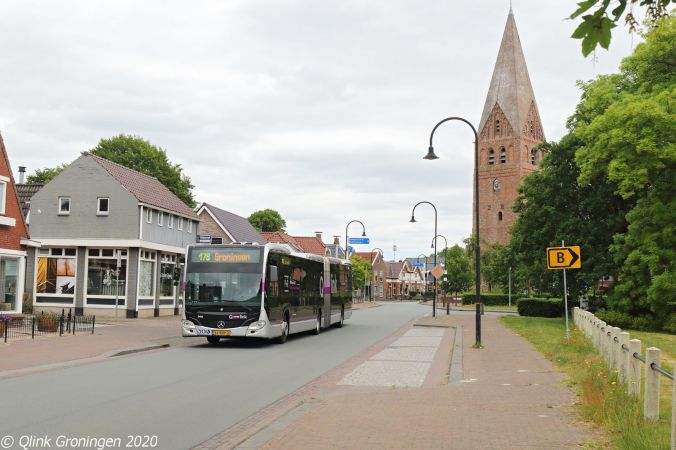 Op lijn 178 tussen Groningen en Siddeburen rijden diverse ritten met Q-link Paars bussen vanwege de coronacrisis. In het begin werden vooral nieuwe Q-link Paars dieselbussen op deze lijn ingezet. In Schildwolde passeert deze lijn een van de twee Juffertorens die de provincie Groningen nog rijk is. Op de foto van 9 juni 2020 komt bus 3452 langs en is op weg naar Groningen.