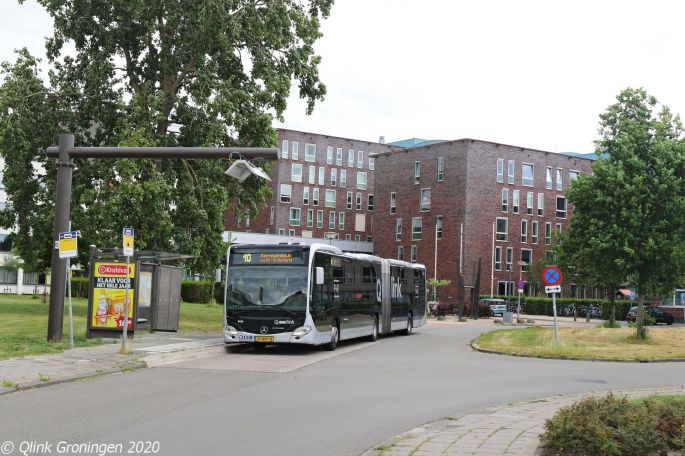 Vanwege de coronacrisis rijden de stadslijnen 7 en 10 in de stad Groningen alleen nog maar met gelede bussen. Doordat er niet voldoende gelede elektrische stadsbussen beschikbaar zijn, rijden op beide lijnen ook twee dieselgelede bussen rond. Op 6 juni 2020 reed zelfs de Q-link reservdieselbus 3458 op lijn 10 tussen Station Noord en Hoornsemeer via de Korrewegwijk. Op de foto is de bus te zien op het eindpunt Maartenshof in Hoornsemeer en vertrekt hij naar de Korrewegwijk op lijn 10.