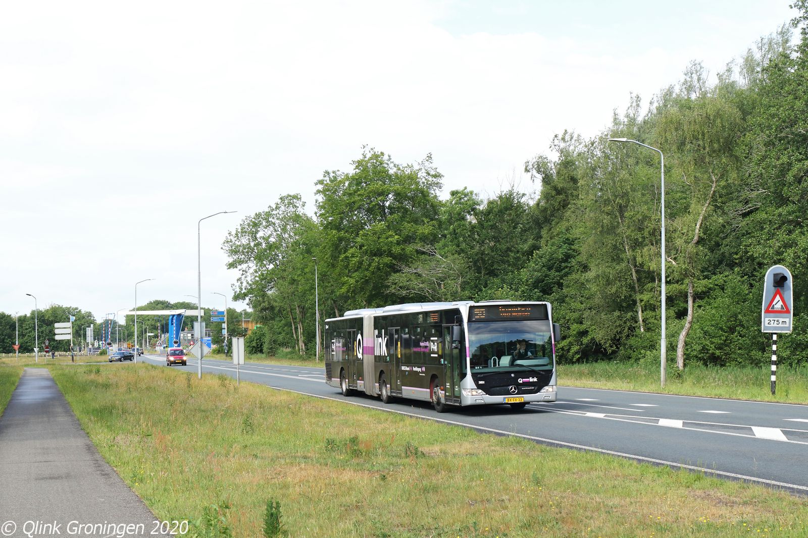 Naast lijn 51 worden ook op lijn 50 tussen Groningen en Assen verschillende ritten uitgevoerd met de oude Q-link Paars-bussen. Op deze lijn, die via Vries, De Punt en Haren rijdt, werd een grote toestroom van passagiers verwacht, die helaas deels uitbleef. De foto toont de bus net na vertrek uit De Punt en op weg als lijn 50 naar Groningen, met bus 3051 die op 4 juni 2020 langs de fotograaf rijdt.
