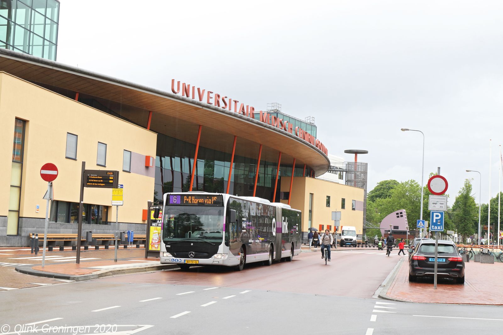 Ondanks dat de oude Q-link Paars bussen vanaf 1 juni 2020 alleen bedoeld waren voor de streekdienst, belandde in het begin van juni een aantal van deze bussen uit 2009 op Q-link 6 tussen P+R Haren en Delfzijl, ondanks dat deze lijnen alleen met de nieuwere Paarse Q-link dieselbussen moesten rijden. Op de foto is bus 3052 te zien voor de hoofdingang van het UMCG in Groningen en zou zo na een korte haltering verder rijden richting P+R Haren op 4 juni 2020 als Q-link 6.