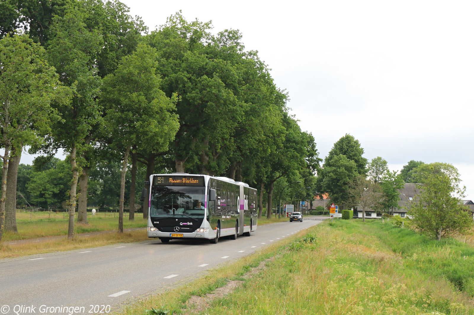 Op lijn 51 rijden ook diverse ritten met de oude Q-link Paarse bussen. Op de lijn die tussen Groningen en Assen rijdt via vele fraaie brinkdorpen, rijdt vanaf 10 uur tot het begin van de dag de bus vooral tussen Annen en Assen, terwijl aan het eind van de middag nog een slag naar Groningen wordt gedaan. Op de foto vertrekt bus 3051 net uit het pittoreske plaatsje Gasteren en is als lijn 51 op weg richting Assen op 4 juni 2020.