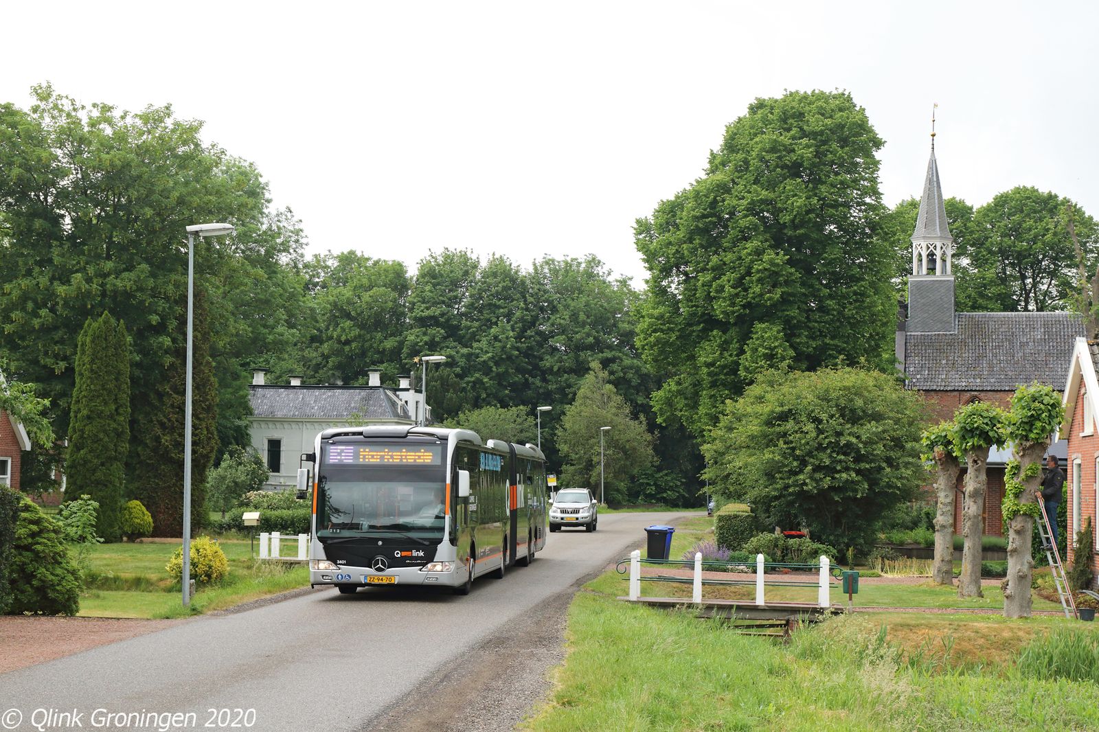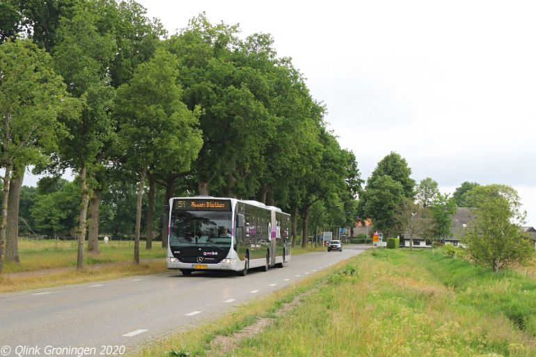 Zoals eerder geschreven, rijden op Q-link 5 de Capacity bussen van Q-link Oranje hun rondjes. Daarbij passeren ze ook regelmatig het prachtige kerkje in Middelbert op weg naar Harkstede. Dit kerkje met de naam Sint Maartenskerk stamt waarschijnlijk uit de 16e eeuw en torent sindsdien fier boven Middelbert uit. Op de foto passeert bus 3401 de fotograaf en is als Q-link 5 op 4 juni 2020 op weg richting Harkstede.