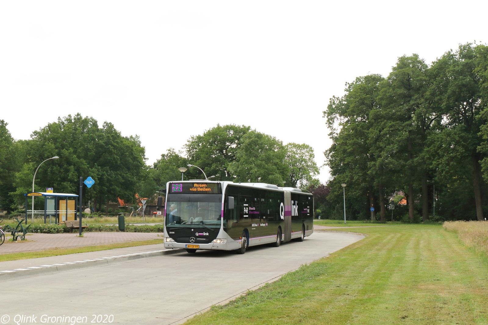 Zoals eerder vermeld, rijden de Q-link Paars-bussen op de schilderachtige lijn 22 tussen Zweeloo en Assen via Beilen. Op het eindpunt in Zweeloo biedt deze lijn aansluiting op lijn 27 richting Hoogeveen en Emmen, waar deze HUB-locatie voor dient. Op de foto staat bus 3096 klaar op het knooppunt in Zweeloo voordat hij als lijn 22 naar Assen vertrekt op 5 juni 2020. Opvallend aan deze lijn is dat de oude lijnkleuren van de P+R Citybuslijn 22 worden getoond in de lijnfilm.