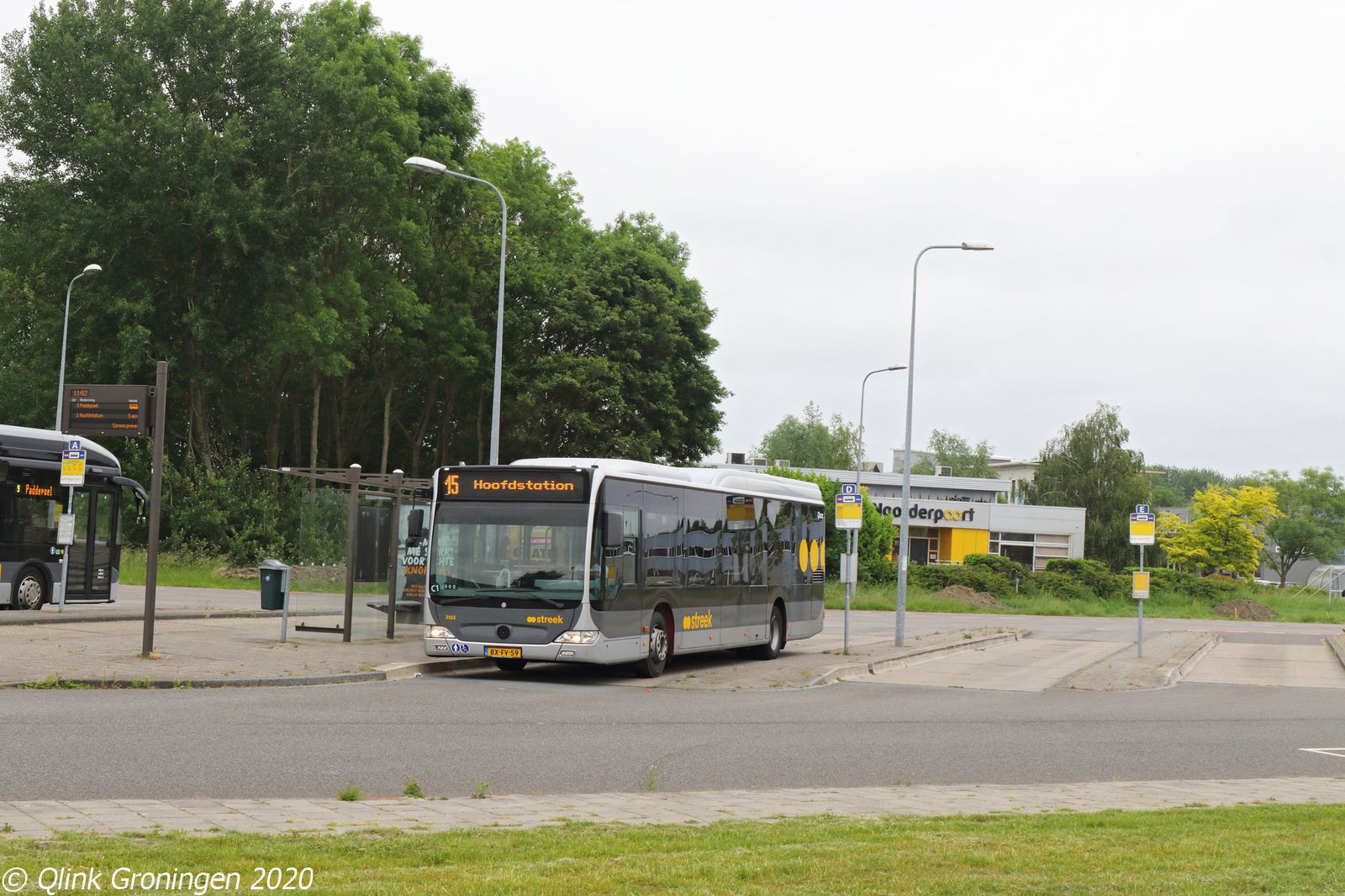 Doordat de hogescholen op Zernike nog niet geopend zijn, worden de Q-link Oranje bussen op Q-link 5 ingezet, zoals eerder geschreven. Op Q-link 15 worden ter vervanging van deze ritten 12-meter streekbussen ingezet. Zelfs de omgebouwde streekbussen uit 2009 rijden op deze lijn hun rondjes op dit moment. Op de foto staat bus 3163 klaar bij de eindhalte Zernike Noord en zou zo meteen op 4 juni 2020 richting het Hoofdstation vertrekken op Q-link 15.