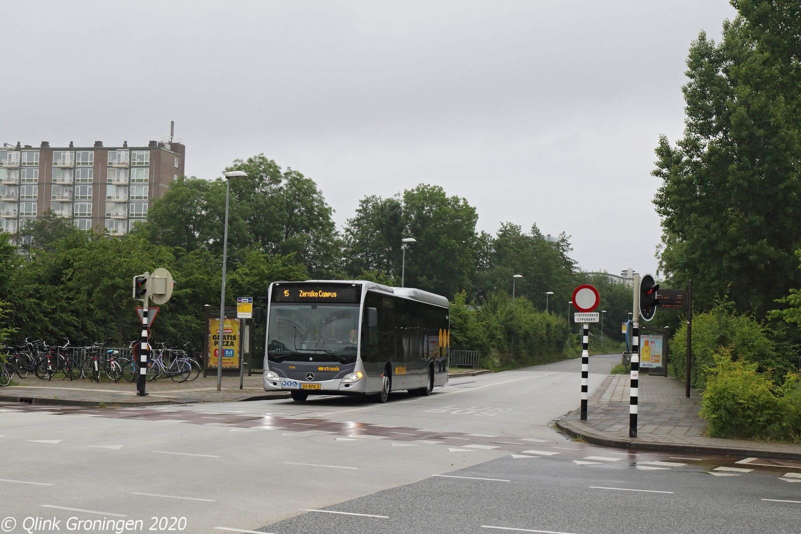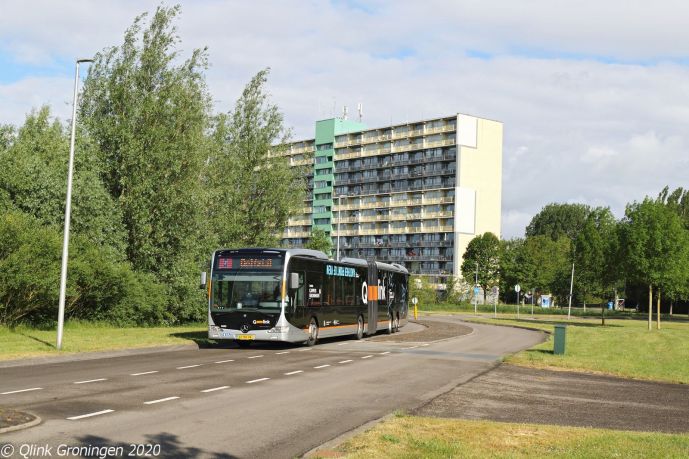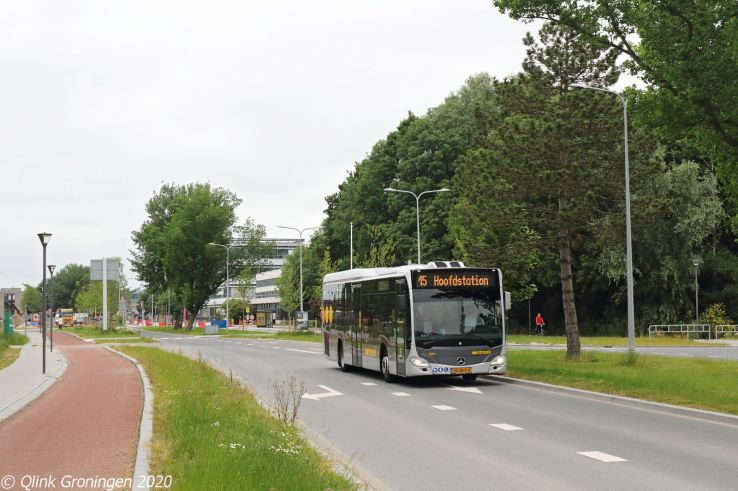 Naast de omgebouwde streekbussen op Q-link 15 rijden ook de nieuwste generatie streekbussen, die met de nieuwe concessie in december 2019 zijn aangekocht voor de streeklijnen in de regio. Om deze en de andere streekbussen vrij te spelen, rijden onder andere de oude Q-link Paars bussen op de streekdienst. Op de foto passeert bus 7104 de fotograaf over de busbaan Peizerbaan ter hoogte van de Koeriersterweg en is als Q-link 15 op 4 juni 2020 op weg richting Zernike.
