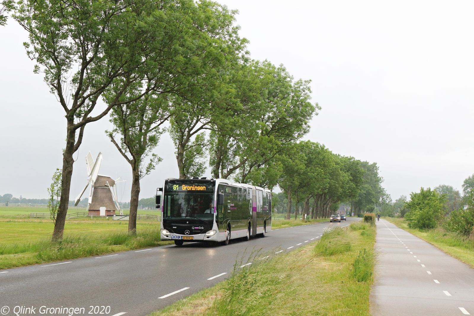 Ondanks dat ook rond Groningen een drietal omlopen met oude Q-link Paarse bussen moesten worden gereden, reden de eerste 2 weken deze omlopen deels met Q-link Paars dieselbussen, welke normaliter op Q-link 6 rondrijden. Op de foto passeert dan ook bus 3462 langs molen de Witte Lam als hij Groningen binnenrijdt op lijn 61, welke de route heeft tussen Uithuizen en de Stad Groningen. Op 4 juni 2020 is de bus op weg richting het Hoofdstation.