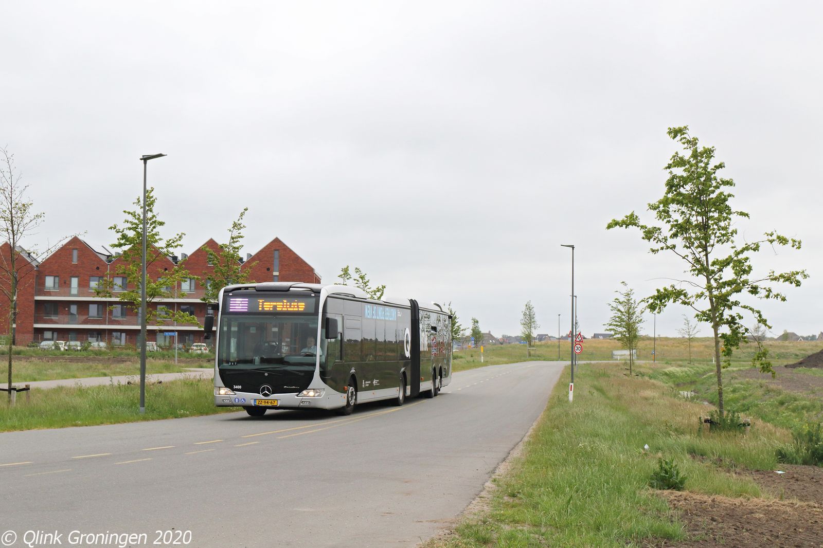 Ook reserve Capacity bus 3400 rijdt zijn rondjes op Q-link 5 samen met zijn oranje soortgenoten. Ondanks dat deze bus nog steeds een reservebus is zonder kleuren, rijdt hij bijna altijd zijn rondjes op Q-link 15 en is het een bijzonderheid om hem nog buiten deze lijn aan te treffen. Op de foto heeft bus 3400 op 4 juni 2020 bijna het eindpunt Tersluis in Meerstad bereikt en zou daarna weer terugkeren op Q-link 5 richting Zuidlaren en Annen.