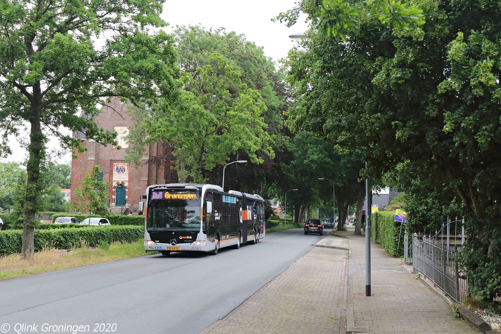Na de foto in Tersluis werd doorgereden naar het andere route deel van Q-link 5 aan de oostkant van de stad: Harkstede. Hier werd ook één van de Q-link Oranje Capacity’s vastgelegd naast de monumentale kerk in Harkstede, welke het normaliter nooit zou passeren. Op de foto rijdt bus 3401 langs de kerk en halte Dorpshuisweg en is op weg richting Groningen op 4 juni 2020 op Q-link lijn 5.